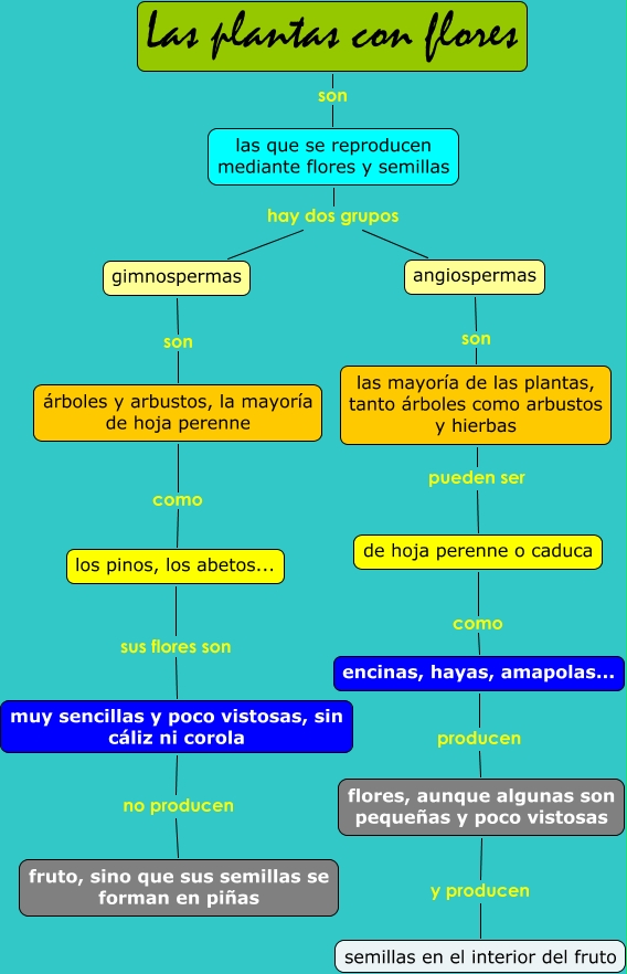 Este Cmap, tiene información relacionada con: Las plantas con flores, las que se reproducen mediante flores y semillas hay dos grupos angiospermas, Las plantas con flores son las que se reproducen mediante flores y semillas, las mayoría de las plantas, tanto árboles como arbustos y hierbas pueden ser de hoja perenne o caduca, los pinos, los abetos... sus flores son muy sencillas y poco vistosas, sin cáliz ni corola, árboles y arbustos, la mayoría de hoja perenne como los pinos, los abetos..., gimnospermas son árboles y arbustos, la mayoría de hoja perenne, las que se reproducen mediante flores y semillas hay dos grupos gimnospermas, muy sencillas y poco vistosas, sin cáliz ni corola no producen fruto, sino que sus semillas se forman en piñas, flores, aunque algunas son pequeñas y poco vistosas y producen semillas en el interior del fruto, de hoja perenne o caduca como encinas, hayas, amapolas..., angiospermas son las mayoría de las plantas, tanto árboles como arbustos y hierbas, encinas, hayas, amapolas... producen flores, aunque algunas son pequeñas y poco vistosas