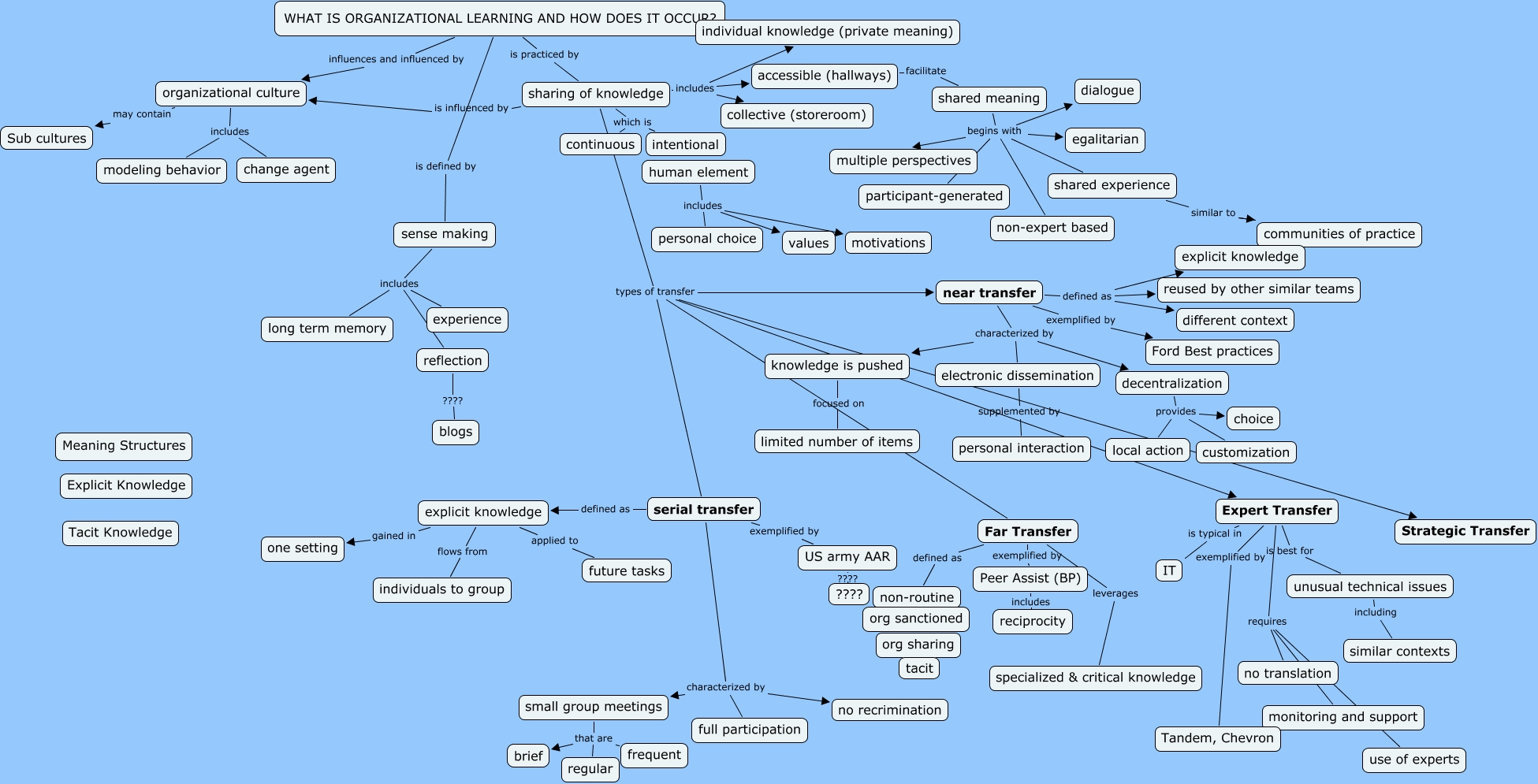This Concept Map, created with IHMC CmapTools, has information related to: Organizational Learning 2011 Karen and Carrie, shared meaning begins with multiple perspectives, organizational culture may contain Sub cultures, reflection ???? blogs, sharing of knowledge includes accessible (hallways), shared meaning begins with egalitarian, accessible (hallways) facilitate shared meaning, sharing of knowledge which is continuous, human element includes values, near transfer characterized by knowledge is pushed, sharing of knowledge includes collective (storeroom), organizational culture includes change agent, decentralization provides customization, Far Transfer exemplified by Peer Assist (BP), small group meetings that are frequent, sense making includes reflection, shared experience similar to communities of practice, shared meaning begins with shared experience, Expert Transfer exemplified by Tandem, Chevron, Far Transfer leverages specialized & critical knowledge, decentralization provides local action