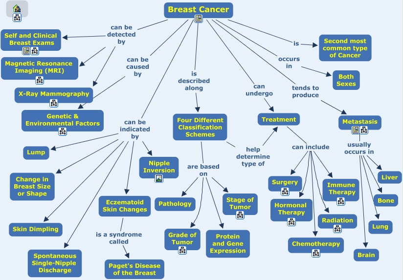 This Concept Map, created with IHMC CmapTools, has information related to: Breast Cancer, Treatment can include Surgery, Breast Cancer tends to produce Metastasis, Breast Cancer can be detected by Magnetic Resonance Imaging (MRI), Treatment can include Hormonal Therapy, Breast Cancer can undergo Treatment, Metastasis usually occurs in Bone, Breast Cancer can be indicated by Lump, Breast Cancer can be indicated by Skin Dimpling, Four Different Classification Schemes are based on Pathology, Breast Cancer can be detected by Self and Clinical Breast Exams, Eczematoid Skin Changes is a syndrome called Paget's Disease of the Breast, Breast Cancer can be indicated by Nipple Inversion, Treatment can include Immune Therapy, Breast Cancer can be indicated by Spontaneous Single-Nipple Discharge, Treatment can include Radiation, Treatment can include Chemotherapy, Four Different Classification Schemes help determine type of Treatment, Metastasis usually occurs in Liver, Four Different Classification Schemes are based on Stage of Tumor, Breast Cancer can be indicated by Eczematoid Skin Changes