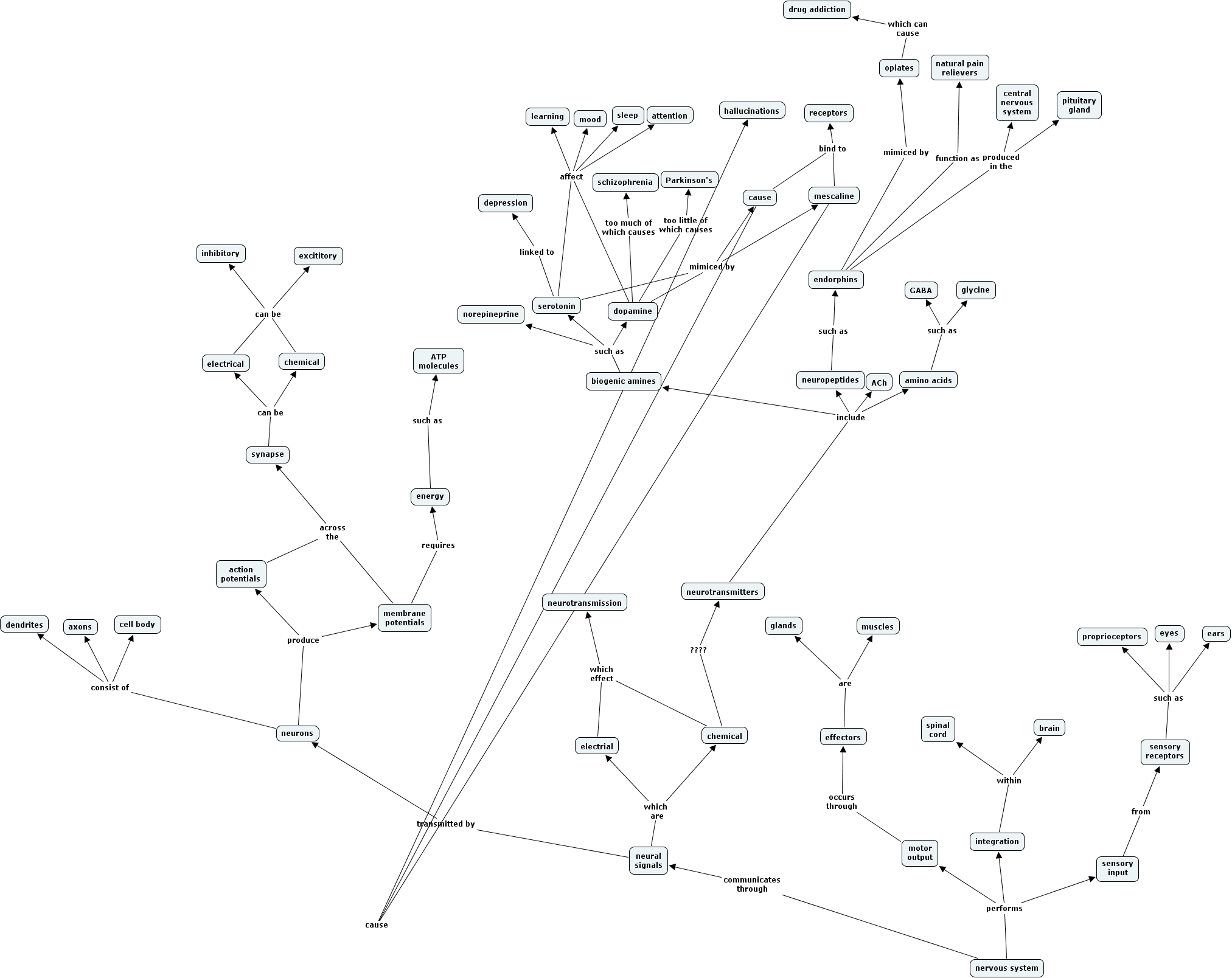 dopamine affect attention, dopamine affect mood, dopamine affect learning, dopamine affect sleep, cause bind to receptors, energy such as ATP molecules, serotonin affect attention, serotonin affect mood, serotonin affect learning, serotonin affect sleep, cause cause hallucinations, mescaline cause hallucinations, chemical can be excititory, chemical can be inhibitory, mescaline bind to receptors, serotonin mimiced by mescaline, serotonin mimiced by cause, opiates which can cause drug addiction, chemical which effect neurotransmission, integration within spinal cord, integration within brain, dopamine too little of which causes Parkinson's, effectors are muscles, effectors are glands, endorphins mimiced by opiates, neurons consist of axons, neurons consist of dendrites, neurons consist of cell body, biogenic amines such as dopamine, biogenic amines such as norepineprine, biogenic amines such as serotonin, nervous system performs sensory input, nervous system performs integration, nervous system performs motor output, neural signals transmitted by neurons, amino acids such as GABA, amino acids such as glycine, neuropeptides such as endorphins, sensory receptors such as proprioceptors, sensory receptors such as eyes, sensory receptors such as ears, endorphins produced in the central nervous system, endorphins produced in the pituitary gland, dopamine mimiced by mescaline, dopamine mimiced by cause, sensory input from sensory receptors, neural signals which are chemical, neural signals which are electrial, membrane potentials across the synapse, synapse can be electrical, synapse can be chemical, endorphins function as natural pain relievers, nervous system communicates through neural signals, chemical ???? neurotransmitters, serotonin linked to depression, electrical can be excititory, electrical can be inhibitory, neurotransmitters include neuropeptides, neurotransmitters include biogenic amines, neurotransmitters include ACh, neurotransmitters include amino acids, electrial which effect neurotransmission, membrane potentials requires energy, motor output occurs through effectors, action potentials across the synapse, dopamine too much of which causes schizophrenia, neurons produce membrane potentials, neurons produce action potentials
