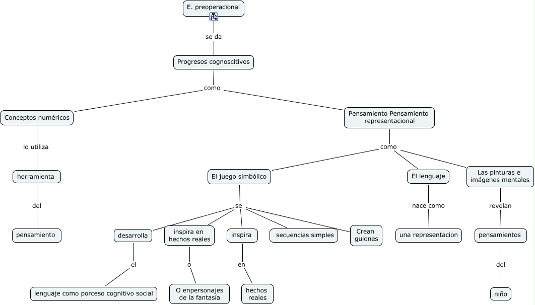 Este Cmap, tiene información relacionada con: e preoprecional, El juego simbólico se inspira, desarrolla el lenguaje como porceso cognitivo social, Conceptos numéricos lo utiliza herramienta, El juego simbólico se desarrolla, El juego simbólico se secuencias simples, El juego simbólico se Crean guiones, inspira en hechos reales, Las pinturas e imágenes mentales revelan pensamientos, Pensamiento Pensamiento representacional como Las pinturas e imágenes mentales, Progresos cognoscitivos como Pensamiento Pensamiento representacional, El juego simbólico se inspira en hechos reales, E. preoperacional se da Progresos cognoscitivos, pensamientos del niño, Pensamiento Pensamiento representacional como El juego simbólico, inspira en hechos reales o O enpersonajes de la fantasía, El lenguaje nace como una representacion, Progresos cognoscitivos como Conceptos numéricos, herramienta del pensamiento, Pensamiento Pensamiento representacional como El lenguaje