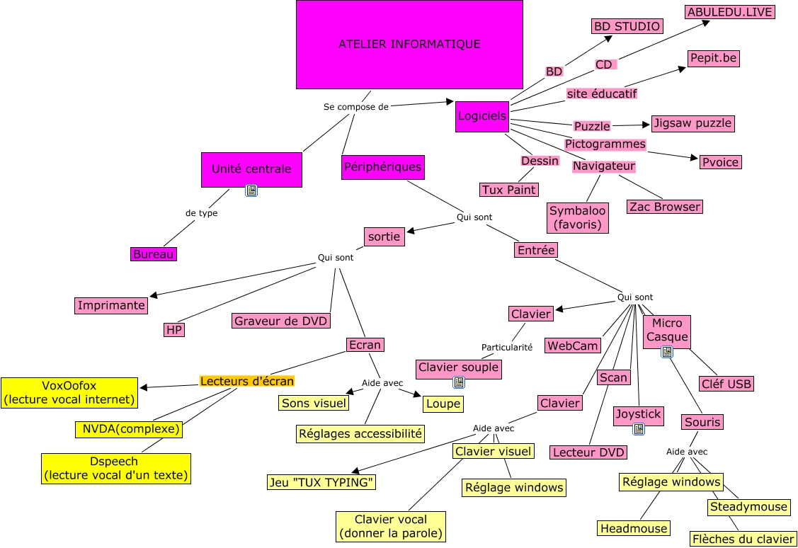 Cette carte de concepts créée avec IHMC CmapTools traite de: Fiche Sophie Z, sortie Qui sont Imprimante, Entrée Qui sont Clavier, ATELIER INFORMATIQUE Se compose de Logiciels, Logiciels Dessin Tux Paint, Logiciels Navigateur Symbaloo (favoris), Ecran Lecteurs d'écran Dspeech (lecture vocal d'un texte), Clavier Particularité Clavier souple, Souris Aide avec Headmouse, Entrée Qui sont Joystick, Ecran Aide avec Loupe, Logiciels Puzzle Jigsaw puzzle, Périphériques Qui sont sortie, Entrée Qui sont WebCam, Unité centrale de type Bureau, sortie Qui sont Ecran, Logiciels Pictogrammes Pvoice, Ecran Aide avec Sons visuel, Clavier Aide avec Clavier visuel, Entrée Qui sont Micro Casque, Entrée Qui sont Cléf USB