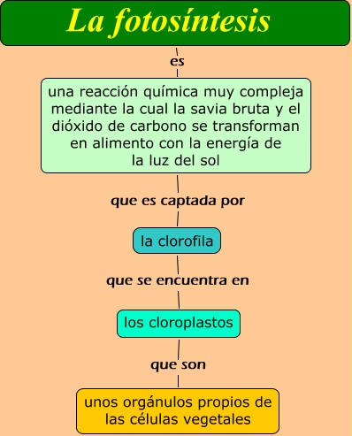 Este Cmap, tiene información relacionada con: La fotosíntesis, una reacción química muy compleja mediante la cual la savia bruta y el dióxido de carbono se transforman en alimento con la energía de la luz del sol que es captada por la clorofila, la clorofila que se encuentra en los cloroplastos, La fotosíntesis es una reacción química muy compleja mediante la cual la savia bruta y el dióxido de carbono se transforman en alimento con la energía de la luz del sol, los cloroplastos que son unos orgánulos propios de las células vegetales