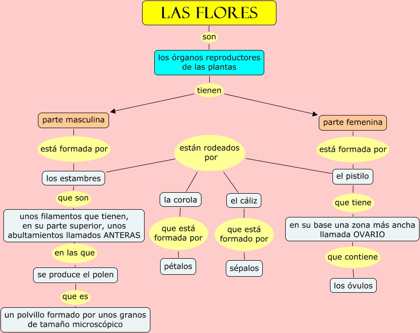 Este Cmap, tiene información relacionada con: Las flores, los estambres que son unos filamentos que tienen, en su parte superior, unos abultamientos llamados ANTERAS, los estambres están rodeados por el pistilo, parte masculina está formada por los estambres, los estambres están rodeados por la corola, los órganos reproductores de las plantas tienen parte masculina, el cáliz que está formado por sépalos, parte femenina está formada por el pistilo, los órganos reproductores de las plantas tienen parte femenina, la corola que está formada por pétalos, Las flores son los órganos reproductores de las plantas, se produce el polen que es un polvillo formado por unos granos de tamaño microscópico, los estambres están rodeados por el cáliz, en su base una zona más ancha llamada OVARIO que contiene los óvulos, el pistilo que tiene en su base una zona más ancha llamada OVARIO, unos filamentos que tienen, en su parte superior, unos abultamientos llamados ANTERAS en las que se produce el polen