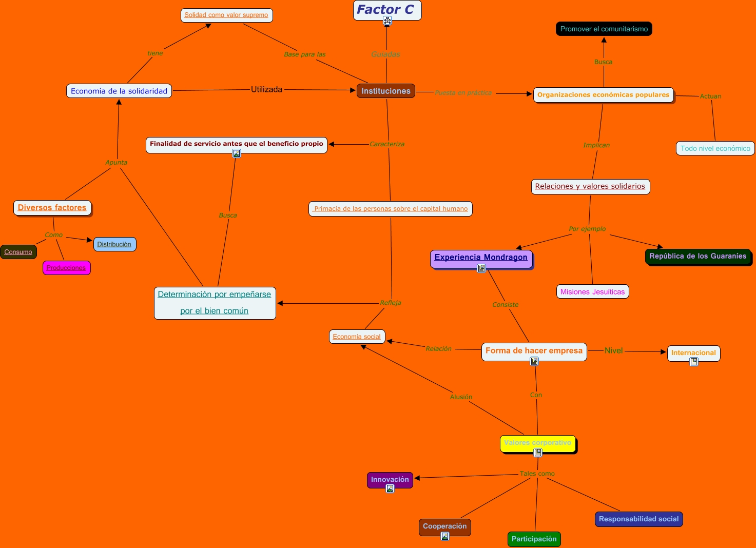Este Cmap, tiene información relacionada con: Instituciones, Relaciones y valores solidarios Por ejemplo Experiencia Mondragon, Organizaciones económicas populares Actuan Todo nivel económico, Diversos factores Como Consumo, Relaciones y valores solidarios Por ejemplo Misiones Jesuíticas, Valores corporativo Tales como Cooperación, Determinación por empeñarse por el bien común Apunta Economía de la solidaridad, Economía de la solidaridad Utilizada Instituciones, Relaciones y valores solidarios Por ejemplo República de los Guaraníes, Economía de la solidaridad tiene Solidad como valor supremo, Instituciones Guiadas Factor C, Forma de hacer empresa Con Valores corporativo, Economía social Refleja Determinación por empeñarse por el bien común, Organizaciones económicas populares Busca Promover el comunitarismo, Valores corporativo Tales como Participación, Organizaciones económicas populares Implican Relaciones y valores solidarios, Diversos factores Como Producciones, Experiencia Mondragon Consiste Forma de hacer empresa, Valores corporativo Alusión Economía social, Valores corporativo Tales como Innovación, Primacía de las personas sobre el capital humano Refleja Determinación por empeñarse por el bien común