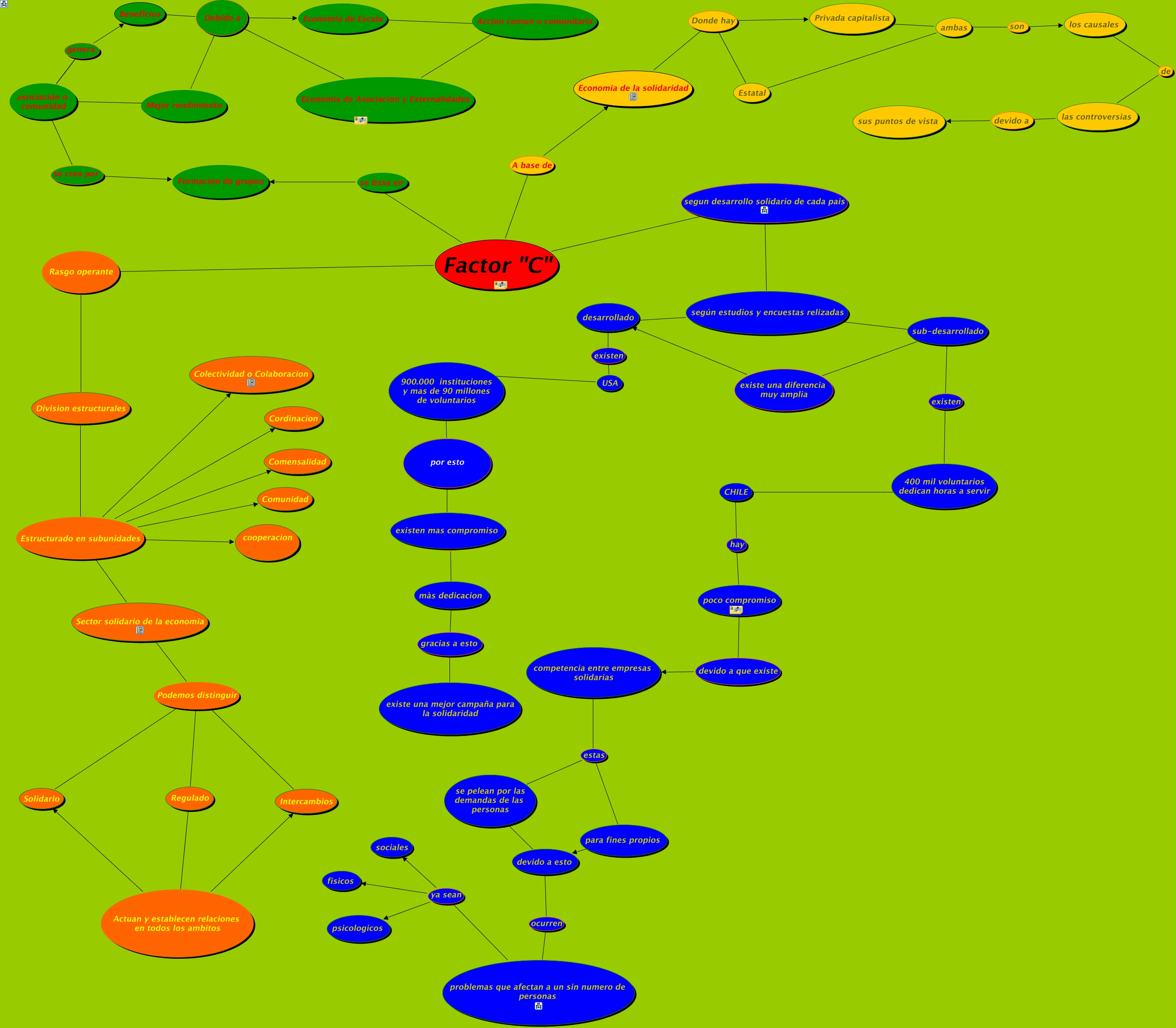 Este Cmap, tiene información relacionada con: Mapa conceptual factor c, existen mas compromiso ???? màs dedicacion, Mejor rendimiento Debido a Economia de Escala, ambas ???? Privada capitalista, Beneficios Debido a Economia de Asociacion y Externalidades, Division estructurales Estructurado en subunidades Sector solidario de la economia, Regulado Actuan y establecen relaciones en todos los ambitos Intercambios, Sector solidario de la economia Podemos distinguir Intercambios, Division estructurales Estructurado en subunidades Comensalidad, según estudios y encuestas relizadas ???? desarrollado, desarrollado existen USA, màs dedicacion gracias a esto existe una mejor campaña para la solidaridad, Division estructurales Estructurado en subunidades Cordinacion, problemas que afectan a un sin numero de personas ya sean sociales, asociación o comunidad se crea por Formacion de grupos, CHILE ???? 400 mil voluntarios dedican horas a servir, Beneficios Debido a Economia de Escala, poco compromiso devido a que existe competencia entre empresas solidarias, los causales de las controversias, Sector solidario de la economia Podemos distinguir Regulado, devido a esto ocurren problemas que afectan a un sin numero de personas