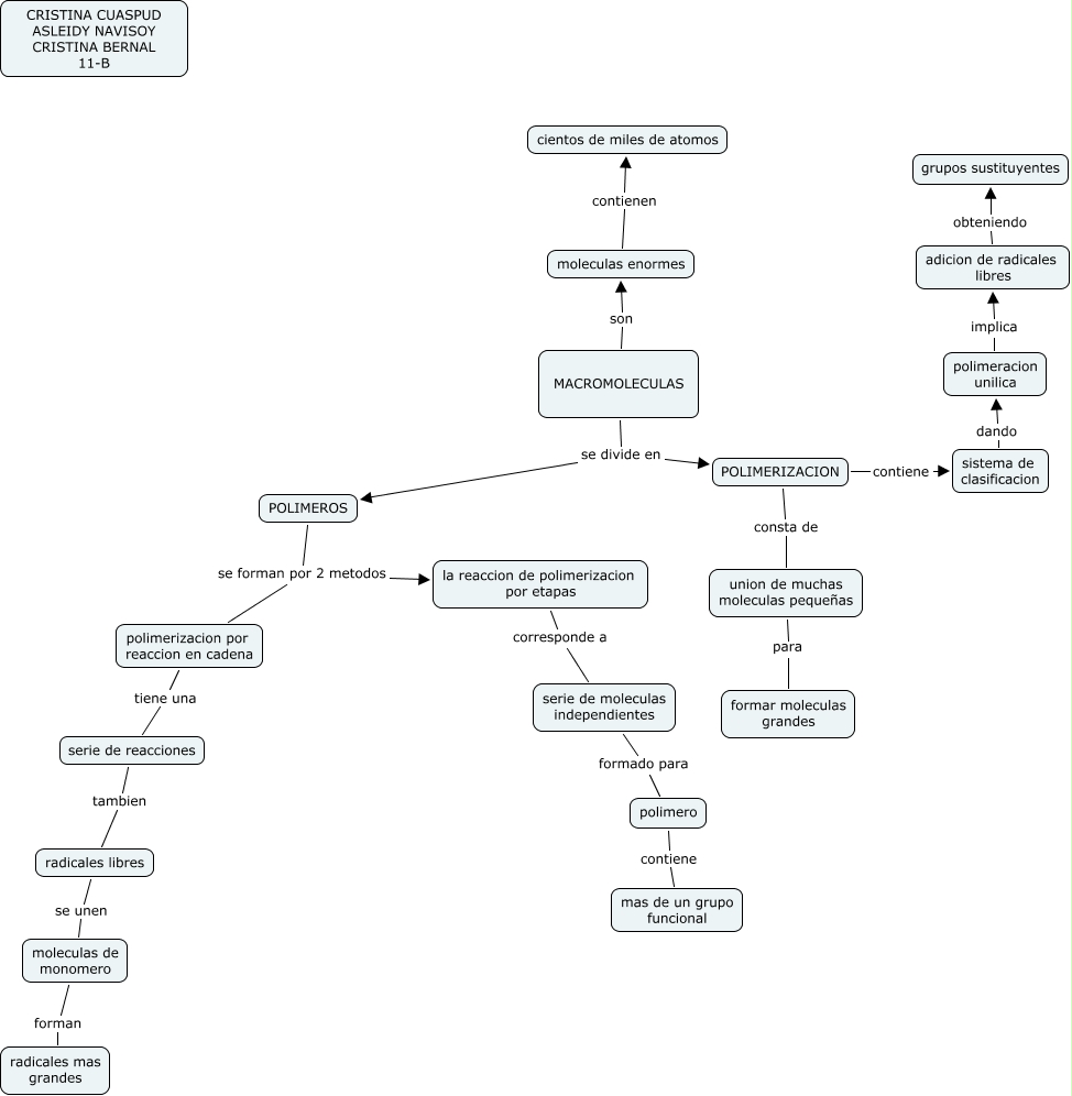 Este Cmap, tiene información relacionada con: MACROMOLECULAS(CRIS,ASLE,JENI).cmap, POLIMERIZACION consta de union de muchas moleculas pequeñas, polimerizacion por reaccion en cadena tiene una serie de reacciones, POLIMEROS se forman por 2 metodos polimerizacion por reaccion en cadena, polimero contiene mas de un grupo funcional, MACROMOLECULAS se divide en POLIMERIZACION, MACROMOLECULAS se divide en POLIMEROS, moleculas de monomero forman radicales mas grandes, polimeracion unilica implica adicion de radicales libres, MACROMOLECULAS son moleculas enormes, la reaccion de polimerizacion por etapas corresponde a serie de moleculas independientes, serie de moleculas independientes formado para polimero, serie de reacciones tambien radicales libres, sistema de clasificacion dando polimeracion unilica, union de muchas moleculas pequeñas para formar moleculas grandes, adicion de radicales libres obteniendo grupos sustituyentes, POLIMEROS se forman por 2 metodos la reaccion de polimerizacion por etapas, moleculas enormes contienen cientos de miles de atomos, POLIMERIZACION contiene sistema de clasificacion, radicales libres se unen moleculas de monomero