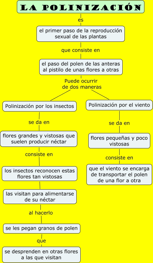 Este Cmap, tiene información relacionada con: La pilinización, La polinización es el primer paso de la reproducción sexual de las plantas, Polinización por los insectos se da en flores grandes y vistosas que suelen producir néctar, flores grandes y vistosas que suelen producir néctar consiste en los insectos reconocen estas flores tan vistosas, los insectos reconocen estas flores tan vistosas las visitan para alimentarse de su néctar, el primer paso de la reproducción sexual de las plantas que consiste en el paso del polen de las anteras al pistilo de unas flores a otras, las visitan para alimentarse de su néctar al hacerlo se les pegan granos de polen, se les pegan granos de polen que se desprenden en otras flores a las que visitan, el paso del polen de las anteras al pistilo de unas flores a otras Puede ocurrir de dos maneras Polinización por los insectos, flores pequeñas y poco vistosas consiste en que el viento se encarga de transportar el polen de una flor a otra, Polinización por el viento se da en flores pequeñas y poco vistosas, el paso del polen de las anteras al pistilo de unas flores a otras Puede ocurrir de dos maneras Polinización por el viento