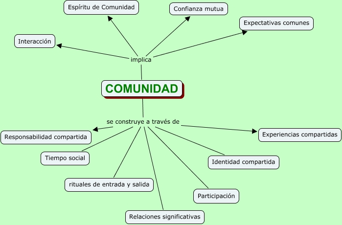 Este Cmap, tiene información relacionada con: Valores de la Comunidad de aprendizaje, COMUNIDAD se construye a través de Responsabilidad compartida, COMUNIDAD implica Expectativas comunes, COMUNIDAD se construye a través de Relaciones significativas, COMUNIDAD se construye a través de Identidad compartida, COMUNIDAD se construye a través de rituales de entrada y salida, COMUNIDAD implica Confianza mutua, COMUNIDAD implica Interacción, COMUNIDAD se construye a través de Tiempo social, COMUNIDAD se construye a través de Participación, COMUNIDAD se construye a través de Experiencias compartidas, COMUNIDAD implica Espíritu de Comunidad