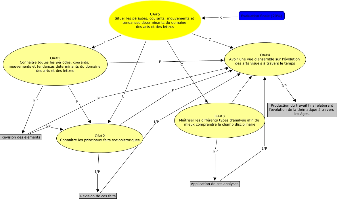 Cette carte de concepts créée avec IHMC CmapTools traite de: UA5, Application de ces analyses I/P OA#4 Avoir une vue d'ensemble sur l'évolution des arts visuels à travers le temps, OA#1 Connaître toutes les périodes, courants, mouvements et tendances déterminants du domaine des arts et des lettres P OA#4 Avoir une vue d'ensemble sur l'évolution des arts visuels à travers le temps, UA#5 Situer les périodes, courants, mouvements et tendances déterminants du domaine des arts et des lettres C OA#1 Connaître toutes les périodes, courants, mouvements et tendances déterminants du domaine des arts et des lettres, OA#1 Connaître toutes les périodes, courants, mouvements et tendances déterminants du domaine des arts et des lettres I/P Révision des éléments, OA#1 Connaître toutes les périodes, courants, mouvements et tendances déterminants du domaine des arts et des lettres P OA#2 Connaître les principaux faits sociohistoriques, Révision des éléments I/P OA#4 Avoir une vue d'ensemble sur l'évolution des arts visuels à travers le temps, Révision des éléments I/P OA#2 Connaître les principaux faits sociohistoriques, OA#4 Avoir une vue d'ensemble sur l'évolution des arts visuels à travers le temps I/P Production du travail final élaborant l'évolution de la thématique à travers les âges., OA#3 Maîtriser les différents types d'analyse afin de mieux comprendre le champ disciplinaire I/P Application de ces analyses, UA#5 Situer les périodes, courants, mouvements et tendances déterminants du domaine des arts et des lettres C OA#2 Connaître les principaux faits sociohistoriques, Évaluation finale (20%) R UA#5 Situer les périodes, courants, mouvements et tendances déterminants du domaine des arts et des lettres, Révision de ces faits I/P OA#4 Avoir une vue d'ensemble sur l'évolution des arts visuels à travers le temps, UA#5 Situer les périodes, courants, mouvements et tendances déterminants du domaine des arts et des lettres C OA#4 Avoir une vue d'ensemble sur l'évolution des arts visuels à travers le temps, OA#2 Connaître les principaux faits sociohistoriques P OA#4 Avoir une vue d'ensemble sur l'évolution des arts visuels à travers le temps, OA#3 Maîtriser les différents types d'analyse afin de mieux comprendre le champ disciplinaire P OA#4 Avoir une vue d'ensemble sur l'évolution des arts visuels à travers le temps, OA#2 Connaître les principaux faits sociohistoriques I/P Révision de ces faits, UA#5 Situer les périodes, courants, mouvements et tendances déterminants du domaine des arts et des lettres C OA#3 Maîtriser les différents types d'analyse afin de mieux comprendre le champ disciplinaire