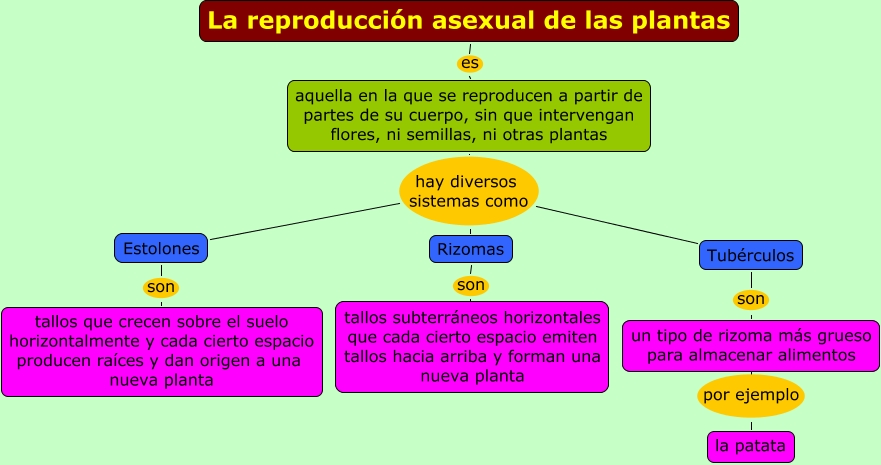 Este Cmap, tiene información relacionada con: La reproducción asexual de las plantas, aquella en la que se reproducen a partir de partes de su cuerpo, sin que intervengan flores, ni semillas, ni otras plantas hay diversos sistemas como Estolones, aquella en la que se reproducen a partir de partes de su cuerpo, sin que intervengan flores, ni semillas, ni otras plantas hay diversos sistemas como Rizomas, La reproducción asexual de las plantas es aquella en la que se reproducen a partir de partes de su cuerpo, sin que intervengan flores, ni semillas, ni otras plantas, Tubérculos son un tipo de rizoma más grueso para almacenar alimentos, aquella en la que se reproducen a partir de partes de su cuerpo, sin que intervengan flores, ni semillas, ni otras plantas hay diversos sistemas como Tubérculos, Rizomas son tallos subterráneos horizontales que cada cierto espacio emiten tallos hacia arriba y forman una nueva planta, Estolones son tallos que crecen sobre el suelo horizontalmente y cada cierto espacio producen raíces y dan origen a una nueva planta, un tipo de rizoma más grueso para almacenar alimentos por ejemplo la patata