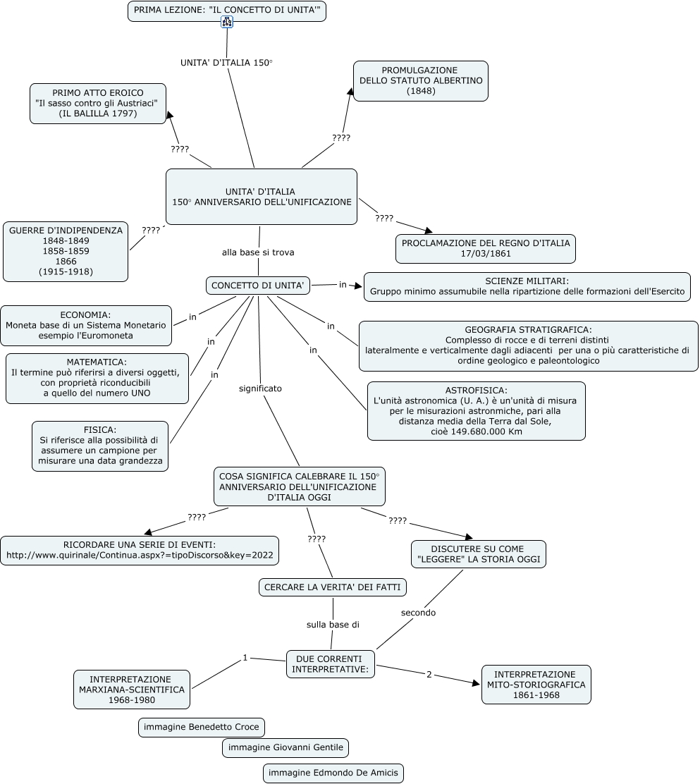 Questa Cmap, creata con IHMC CmapTools, contiene informazioni relative a: CELEBRAZIONE 150 ANNI- lezione1, UNITA' D'ITALIA 150° ANNIVERSARIO DELL'UNIFICAZIONE alla base si trova CONCETTO DI UNITA', DUE CORRENTI INTERPRETATIVE: 1 INTERPRETAZIONE MARXIANA-SCIENTIFICA 1968-1980, UNITA' D'ITALIA 150° ANNIVERSARIO DELL'UNIFICAZIONE ???? PROCLAMAZIONE DEL REGNO D'ITALIA 17/03/1861, CONCETTO DI UNITA' significato COSA SIGNIFICA CALEBRARE IL 150° ANNIVERSARIO DELL'UNIFICAZIONE D'ITALIA OGGI, CONCETTO DI UNITA' in SCIENZE MILITARI: Gruppo minimo assumubile nella ripartizione delle formazioni dell'Esercito, CONCETTO DI UNITA' in ASTROFISICA: L'unità astronomica (U. A.) è un'unità di misura per le misurazioni astronmiche, pari alla distanza media della Terra dal Sole, cioè 149.680.000 Km, CONCETTO DI UNITA' in ECONOMIA: Moneta base di un Sistema Monetario esempio l'Euromoneta, CONCETTO DI UNITA' in MATEMATICA: Il termine può riferirsi a diversi oggetti, con proprietà riconducibili a quello del numero UNO, CONCETTO DI UNITA' in GEOGRAFIA STRATIGRAFICA: Complesso di rocce e di terreni distinti lateralmente e verticalmente dagli adiacenti per una o più caratteristiche di ordine geologico e paleontologico, COSA SIGNIFICA CALEBRARE IL 150° ANNIVERSARIO DELL'UNIFICAZIONE D'ITALIA OGGI ???? CERCARE LA VERITA' DEI FATTI, DUE CORRENTI INTERPRETATIVE: 2 INTERPRETAZIONE MITO-STORIOGRAFICA 1861-1968, COSA SIGNIFICA CALEBRARE IL 150° ANNIVERSARIO DELL'UNIFICAZIONE D'ITALIA OGGI ???? DISCUTERE SU COME "LEGGERE" LA STORIA OGGI, UNITA' D'ITALIA 150° ANNIVERSARIO DELL'UNIFICAZIONE ???? GUERRE D'INDIPENDENZA 1848-1849 1858-1859 1866 (1915-1918), UNITA' D'ITALIA 150° ANNIVERSARIO DELL'UNIFICAZIONE ???? PRIMO ATTO EROICO "Il sasso contro gli Austriaci" (IL BALILLA 1797), CERCARE LA VERITA' DEI FATTI sulla base di DUE CORRENTI INTERPRETATIVE:, PRIMA LEZIONE: "IL CONCETTO DI UNITA'" UNITA' D'ITALIA 150° UNITA' D'ITALIA 150° ANNIVERSARIO DELL'UNIFICAZIONE, CONCETTO DI UNITA' in FISICA: Si riferisce alla possibilità di assumere un campione per misurare una data grandezza, UNITA' D'ITALIA 150° ANNIVERSARIO DELL'UNIFICAZIONE ???? PROMULGAZIONE DELLO STATUTO ALBERTINO (1848), COSA SIGNIFICA CALEBRARE IL 150° ANNIVERSARIO DELL'UNIFICAZIONE D'ITALIA OGGI ???? RICORDARE UNA SERIE DI EVENTI: http://www.quirinale/Continua.aspx?=tipoDiscorso&key=2022, DISCUTERE SU COME "LEGGERE" LA STORIA OGGI secondo DUE CORRENTI INTERPRETATIVE: