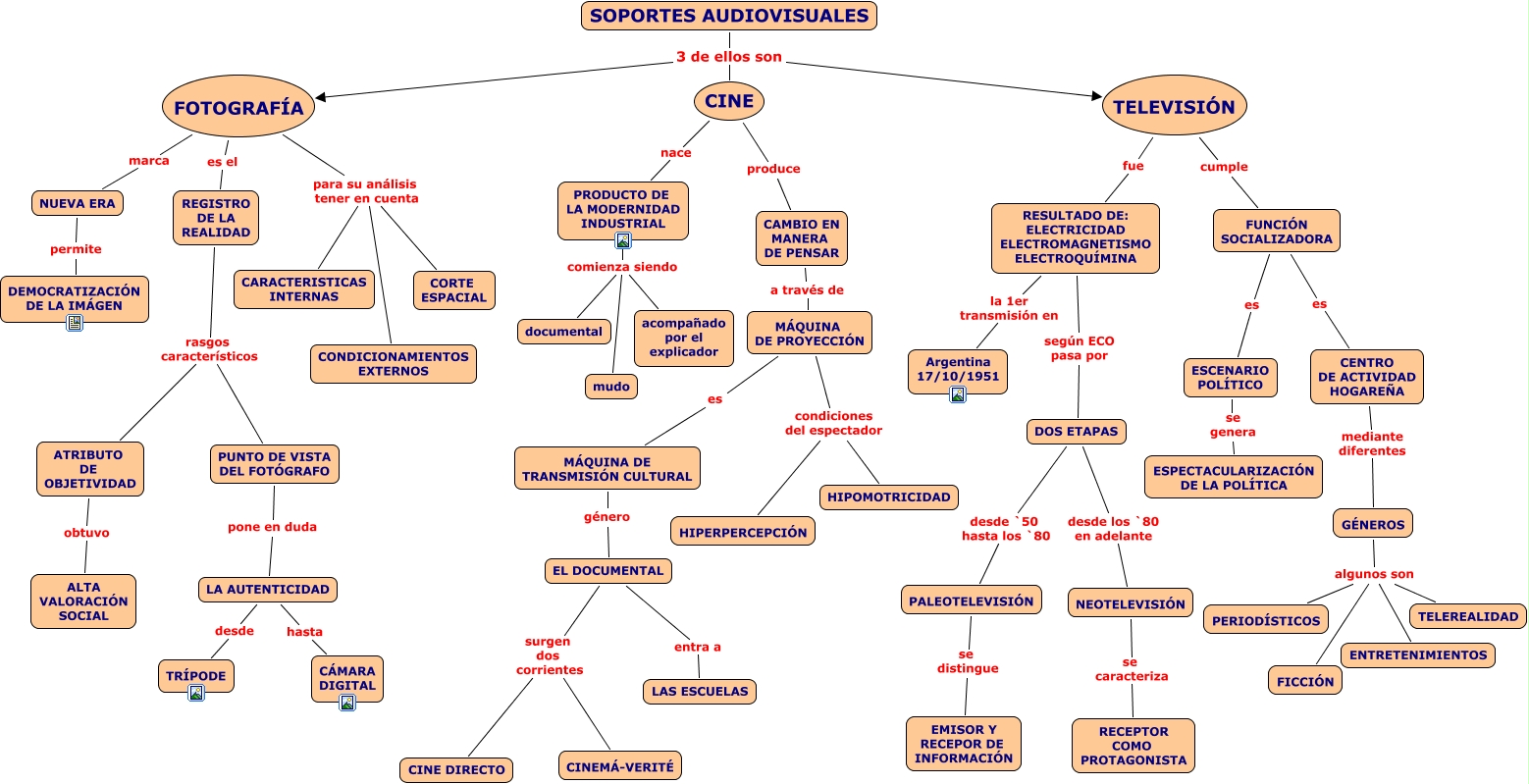 Este Cmap, tiene información relacionada con: soportes audiovisuales, RESULTADO DE: ELECTRICIDAD ELECTROMAGNETISMO ELECTROQUÍMINA según ECO pasa por DOS ETAPAS, SOPORTES AUDIOVISUALES 3 de ellos son TELEVISIÓN, FOTOGRAFÍA marca NUEVA ERA, FOTOGRAFÍA para su análisis tener en cuenta CARACTERISTICAS INTERNAS, PRODUCTO DE LA MODERNIDAD INDUSTRIAL comienza siendo documental, ESCENARIO POLÍTICO se genera ESPECTACULARIZACIÓN DE LA POLÍTICA, FOTOGRAFÍA para su análisis tener en cuenta CONDICIONAMIENTOS EXTERNOS, PRODUCTO DE LA MODERNIDAD INDUSTRIAL comienza siendo acompañado por el explicador, PALEOTELEVISIÓN se distingue EMISOR Y RECEPOR DE INFORMACIÓN, MÁQUINA DE PROYECCIÓN condiciones del espectador HIPOMOTRICIDAD, MÁQUINA DE PROYECCIÓN es MÁQUINA DE TRANSMISIÓN CULTURAL, PUNTO DE VISTA DEL FOTÓGRAFO pone en duda LA AUTENTICIDAD, MÁQUINA DE TRANSMISIÓN CULTURAL género EL DOCUMENTAL, TELEVISIÓN cumple FUNCIÓN SOCIALIZADORA, REGISTRO DE LA REALIDAD rasgos característicos PUNTO DE VISTA DEL FOTÓGRAFO, EL DOCUMENTAL entra a LAS ESCUELAS, EL DOCUMENTAL surgen dos corrientes CINE DIRECTO, DOS ETAPAS desde `50 hasta los `80 PALEOTELEVISIÓN, FOTOGRAFÍA para su análisis tener en cuenta CORTE ESPACIAL, LA AUTENTICIDAD hasta CÁMARA DIGITAL