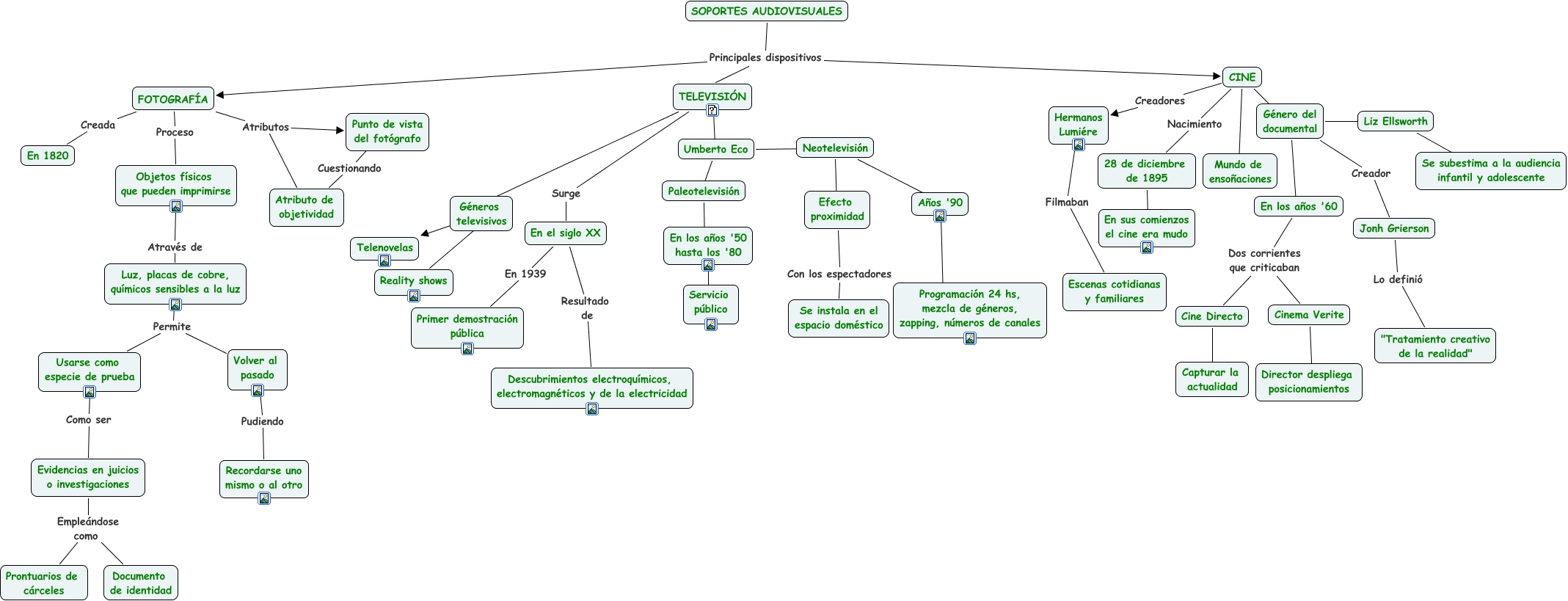 Este Cmap, tiene información relacionada con: soportes audiovisuales, En el siglo XX En 1939 Primer demostración pública, Años '90 ???? Programación 24 hs, mezcla de géneros, zapping, números de canales, En los años '50 hasta los '80 ???? Servicio público, SOPORTES AUDIOVISUALES Principales dispositivos CINE, Cine Directo ???? Capturar la actualidad, Volver al pasado Pudiendo Recordarse uno mismo o al otro, Géneros televisivos ???? Reality shows, CINE Nacimiento 28 de diciembre de 1895, FOTOGRAFÍA Creada En 1820, Género del documental ???? Liz Ellsworth, En el siglo XX Resultado de Descubrimientos electroquímicos, electromagnéticos y de la electricidad, Umberto Eco ???? Neotelevisión, Géneros televisivos ???? Telenovelas, CINE Creadores Hermanos Lumiére, Luz, placas de cobre, químicos sensibles a la luz Permite Volver al pasado, Paleotelevisión ???? En los años '50 hasta los '80, SOPORTES AUDIOVISUALES Principales dispositivos TELEVISIÓN, En los años '60 Dos corrientes que criticaban Cine Directo, Género del documental Creador Jonh Grierson, Cinema Verite ???? Director despliega posicionamientos
