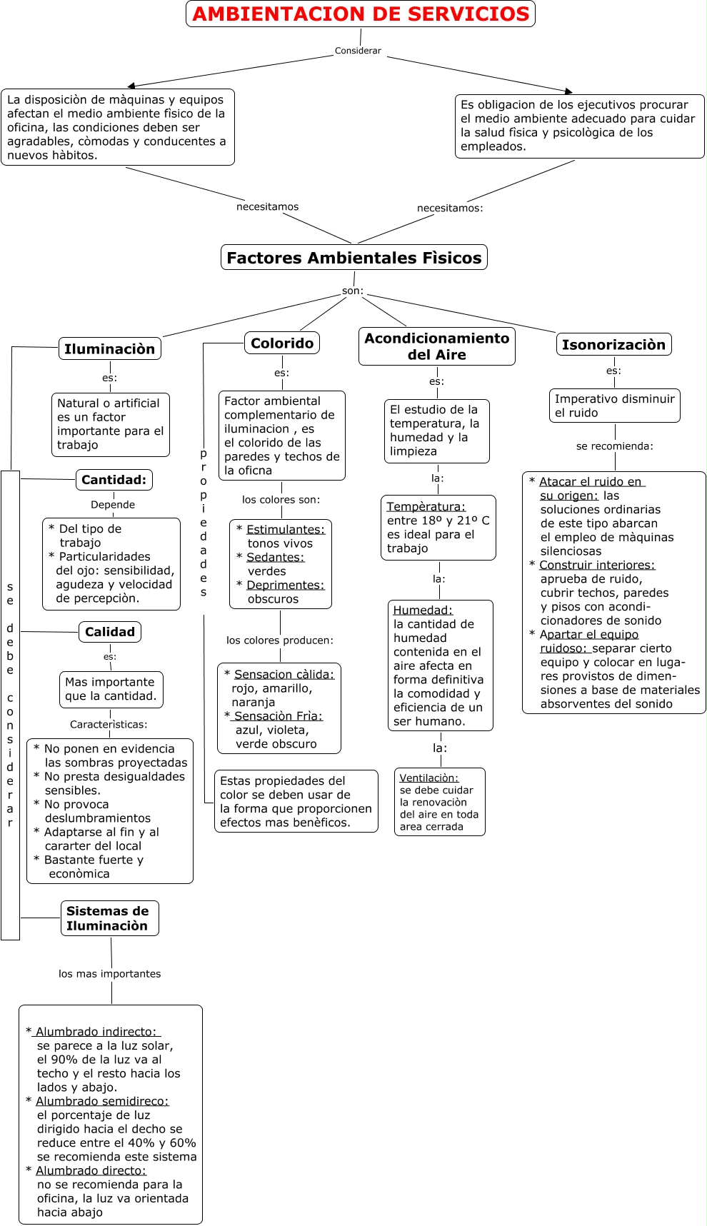 Este Cmap, tiene información relacionada con: Ambientacón de Servicios, Imperativo disminuir el ruido se recomienda: * Atacar el ruido en su origen: las soluciones ordinarias de este tipo abarcan el empleo de màquinas silenciosas * Construir interiores: aprueba de ruido, cubrir techos, paredes y pisos con acondi- cionadores de sonido * Apartar el equipo ruidoso: separar cierto equipo y colocar en luga- res provistos de dimen- siones a base de materiales absorventes del sonido, AMBIENTACION DE SERVICIOS Considerar La disposiciòn de màquinas y equipos afectan el medio ambiente fìsico de la oficina, las condiciones deben ser agradables, còmodas y conducentes a nuevos hàbitos., Acondicionamiento del Aire es: El estudio de la temperatura, la humedad y la limpieza, Factores Ambientales Fìsicos son: Colorido, Calidad es: Mas importante que la cantidad., Factores Ambientales Fìsicos son: Acondicionamiento del Aire, Cantidad: Depende * Del tipo de trabajo * Particularidades del ojo: sensibilidad, agudeza y velocidad de percepciòn., Iluminaciòn s e d e b e c o n s i d e r a r Sistemas de Iluminaciòn, Factores Ambientales Fìsicos son: Iluminaciòn, Iluminaciòn es: Natural o artificial es un factor importante para el trabajo, * Estimulantes: tonos vivos * Sedantes: verdes * Deprimentes: obscuros los colores producen: * Sensacion càlida: rojo, amarillo, naranja * Sensaciòn Frìa: azul, violeta, verde obscuro, Sistemas de Iluminaciòn los mas importantes * Alumbrado indirecto: se parece a la luz solar, el 90% de la luz va al techo y el resto hacia los lados y abajo. * Alumbrado semidireco: el porcentaje de luz dirigido hacia el decho se reduce entre el 40% y 60% se recomienda este sistema * Alumbrado directo: no se recomienda para la oficina, la luz va orientada hacia abajo, Isonorizaciòn es: Imperativo disminuir el ruido, El estudio de la temperatura, la humedad y la limpieza la: Tempèratura: entre 18º y 21º C es ideal para el trabajo, Factores Ambientales Fìsicos son: Isonorizaciòn, AMBIENTACION DE SERVICIOS Considerar Es obligacion de los ejecutivos procurar el medio ambiente adecuado para cuidar la salud fìsica y psicològica de los empleados., Factores Ambientales Fìsicos necesitamos: Es obligacion de los ejecutivos procurar el medio ambiente adecuado para cuidar la salud fìsica y psicològica de los empleados., Factor ambiental complementario de iluminacion , es el colorido de las paredes y techos de la oficna los colores son: * Estimulantes: tonos vivos * Sedantes: verdes * Deprimentes: obscuros, Factores Ambientales Fìsicos necesitamos La disposiciòn de màquinas y equipos afectan el medio ambiente fìsico de la oficina, las condiciones deben ser agradables, còmodas y conducentes a nuevos hàbitos., Humedad: la cantidad de humedad contenida en el aire afecta en forma definitiva la comodidad y eficiencia de un ser humano. la: Ventilaciòn: se debe cuidar la renovaciòn del aire en toda area cerrada