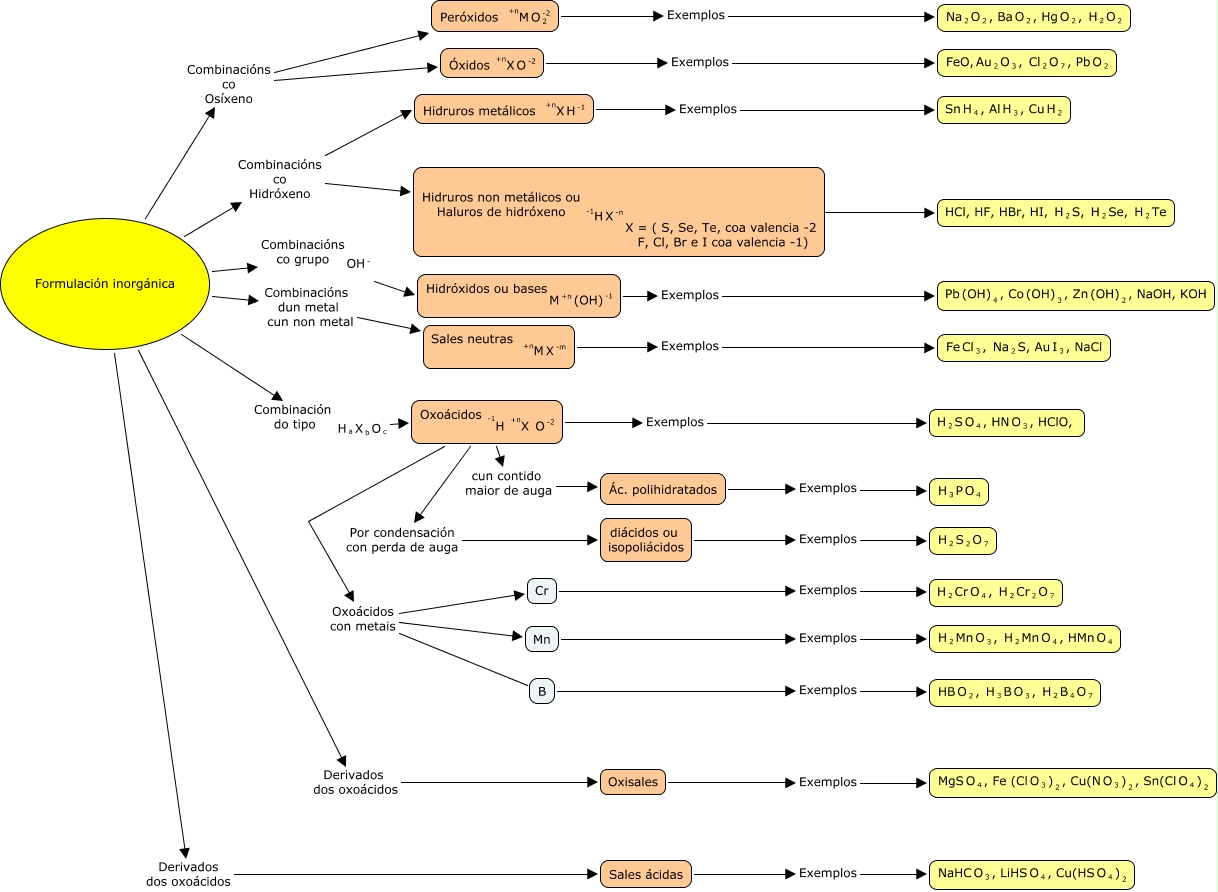 </mtext> <mmultiscripts> <mtext> M </mtext> <none/> <mtext> +n </mtext> </mmultiscripts> <mmultiscripts> <mtext> (OH) </mtext> <none/> <mtext> -1 </mtext> </mmultiscripts> </mrow> </math> Exemplos <math xmlns="http://www.w3.org/1998/Math/MathML"> <mrow> <mtext> Pb </mtext> <mmultiscripts> <mtext> (OH) </mtext> <mtext> 4 </mtext> <none/> </mmultiscripts> <mtext> , Co </mtext> <mmultiscripts> <mtext> (OH) </mtext> <mtext> 3 </mtext> <none/> </mmultiscripts> <mtext> , Zn </mtext> <mmultiscripts> <mtext> (OH) </mtext> <mtext> 2 </mtext> <none/> </mmultiscripts> <mtext> , NaOH, KOH </mtext> </mrow> </math>, Formulación inorgánica Combinacións co Osíxeno <math xmlns="http://www.w3.org/1998/Math/MathML"> <mrow> <mtext> Peróxidos </mtext> <mmultiscripts> <mrow> <mtext> M </mtext> <mmultiscripts> <mtext> O </mtext> <mtext> 2 </mtext> <mtext> -2 </mtext> </mmultiscripts> </mrow> <none/> <none/> <mprescripts/> <none/> <mtext> +n </mtext> </mmultiscripts> </mrow> </math>, <math xmlns="http://www.w3.org/1998/Math/MathML"> <mrow> <mtext> Óxidos </mtext> <mmultiscripts> <mrow> <mtext> X </mtext> <mmultiscripts> <mtext> O </mtext> <none/> <mtext> -2 </mtext> </mmultiscripts> </mrow> <none/> <none/> <mprescripts/> <none/> <mtext> +n </mtext> </mmultiscripts> </mrow> </math> Exemplos <math xmlns="http://www.w3.org/1998/Math/MathML"> <mrow> <mtext> FeO, </mtext> <mmultiscripts> <mtext> Au </mtext> <mtext> 2 </mtext> <none/> </mmultiscripts> <mmultiscripts> <mtext> O </mtext> <mtext> 3 </mtext> <none/> </mmultiscripts> <mtext> , </mtext> <mmultiscripts> <mtext> Cl </mtext> <mtext> 2 </mtext> <none/> </mmultiscripts> <mmultiscripts> <mtext> O </mtext> <mtext> 7 </mtext> <none/> </mmultiscripts> <mtext> , Pb </mtext> <mmultiscripts> <mtext> O </mtext> <mtext> 2 </mtext> <none/> </mmultiscripts> </mrow> </math>, Sales ácidas Exemplos <math xmlns="http://www.w3.org/1998/Math/MathML"> <mrow> <mtext> NaHC </mtext> <mmultiscripts> <mtext> O </mtext> <mtext> 3 </mtext> <none/> </mmultiscripts> <mtext> , LiHS </mtext> <mmultiscripts> <mtext> O </mtext> <mtext> 4 </mtext> <none/> </mmultiscripts> <mtext> , Cu(HS </mtext> <mmultiscripts> <mtext> O </mtext> <mtext> 4 </mtext> <none/> </mmultiscripts> <mmultiscripts> <mtext> ) </mtext> <mtext> 2 </mtext> <none/> </mmultiscripts> </mrow> </math>