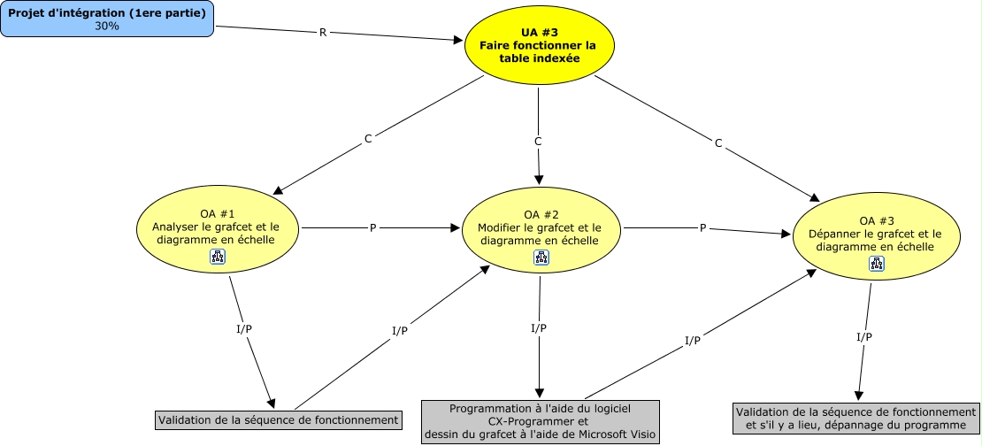 Cette carte de concepts créée avec IHMC CmapTools traite de: UA_3, Validation de la séquence de fonctionnement I/P OA #2 Modifier le grafcet et le diagramme en échelle, Projet d'intégration (1ere partie) 30% R UA #3 Faire fonctionner la table indexée, OA #3 Dépanner le grafcet et le diagramme en échelle I/P Validation de la séquence de fonctionnement et s'il y a lieu, dépannage du programme, OA #2 Modifier le grafcet et le diagramme en échelle P OA #3 Dépanner le grafcet et le diagramme en échelle, OA #2 Modifier le grafcet et le diagramme en échelle I/P Programmation à l'aide du logiciel CX-Programmer et dessin du grafcet à l'aide de Microsoft Visio, OA #1 Analyser le grafcet et le diagramme en échelle P OA #2 Modifier le grafcet et le diagramme en échelle, UA #3 Faire fonctionner la table indexée C OA #2 Modifier le grafcet et le diagramme en échelle, UA #3 Faire fonctionner la table indexée C OA #3 Dépanner le grafcet et le diagramme en échelle, Programmation à l'aide du logiciel CX-Programmer et dessin du grafcet à l'aide de Microsoft Visio I/P OA #3 Dépanner le grafcet et le diagramme en échelle, UA #3 Faire fonctionner la table indexée C OA #1 Analyser le grafcet et le diagramme en échelle, OA #1 Analyser le grafcet et le diagramme en échelle I/P Validation de la séquence de fonctionnement