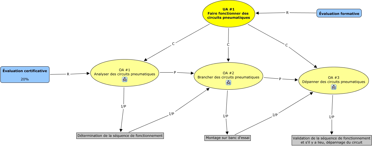 Cette carte de concepts créée avec IHMC CmapTools traite de: UA_1, Détermination de la séquence de fonctionnement I/P OA #2 Brancher des circuits pneumatiques, OA #3 Dépanner des circuits pneumatiques I/P Validation de la séquence de fonctionnement et s'il y a lieu, dépannage du circuit, OA #2 Brancher des circuits pneumatiques P OA #3 Dépanner des circuits pneumatiques, OA #2 Brancher des circuits pneumatiques I/P Montage sur banc d'essai, OA #1 Analyser des circuits pneumatiques P OA #2 Brancher des circuits pneumatiques, UA #1 Faire fonctionner des circuits pneumatiques C OA #2 Brancher des circuits pneumatiques, UA #1 Faire fonctionner des circuits pneumatiques C OA #3 Dépanner des circuits pneumatiques, Évaluation formative R UA #1 Faire fonctionner des circuits pneumatiques, Évaluation certificative 20% R OA #1 Analyser des circuits pneumatiques, Montage sur banc d'essai I/P OA #3 Dépanner des circuits pneumatiques, UA #1 Faire fonctionner des circuits pneumatiques C OA #1 Analyser des circuits pneumatiques, OA #1 Analyser des circuits pneumatiques I/P Détermination de la séquence de fonctionnement