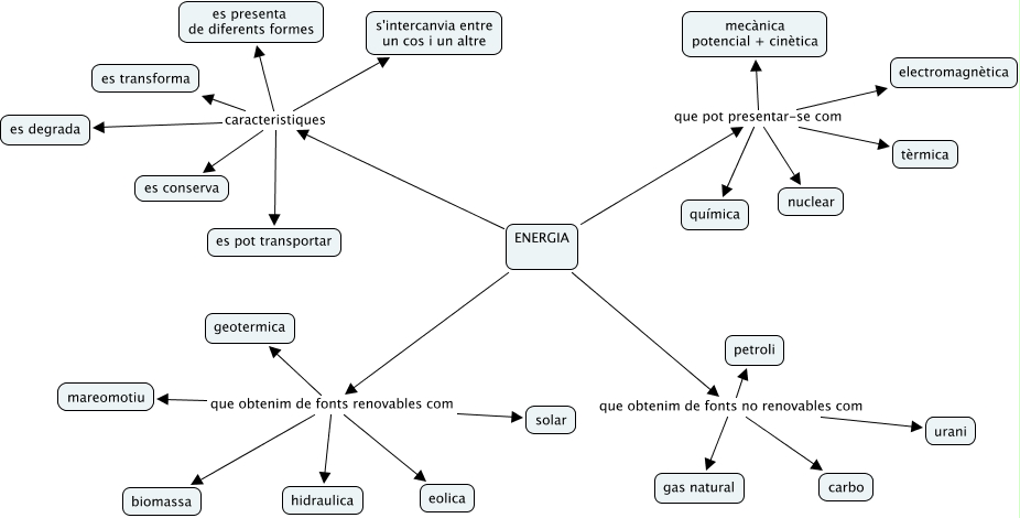 Aquest mapa conceptual conté informació relacionada amb: energia2ESOA, ENERGIA que obtenim de fonts renovables com hidraulica, ENERGIA que pot presentar-se com nuclear, ENERGIA caracteristiques es degrada, ENERGIA que obtenim de fonts renovables com geotermica, ENERGIA que obtenim de fonts renovables com mareomotiu, ENERGIA que obtenim de fonts no renovables com carbo, ENERGIA que obtenim de fonts no renovables com petroli, ENERGIA caracteristiques es conserva, ENERGIA que obtenim de fonts renovables com eolica, ENERGIA caracteristiques es transforma, ENERGIA que pot presentar-se com mecànica potencial + cinètica, ENERGIA que obtenim de fonts renovables com biomassa, ENERGIA que pot presentar-se com química, ENERGIA que obtenim de fonts no renovables com gas natural, ENERGIA que obtenim de fonts renovables com solar, ENERGIA que obtenim de fonts no renovables com urani, ENERGIA caracteristiques s'intercanvia entre un cos i un altre, ENERGIA que pot presentar-se com tèrmica, ENERGIA caracteristiques es pot transportar, ENERGIA caracteristiques es presenta de diferents formes