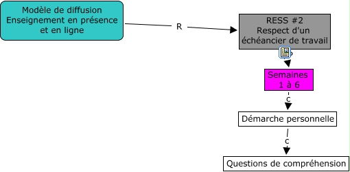 Cette carte de concepts créée avec IHMC CmapTools traite de: RESS 2, RESS #2 Respect d'un échéancier de travail I/P Semaines 1 à 6, Démarche personnelle c Questions de compréhension, Modèle de diffusion Enseignement en présence et en ligne R RESS #2 Respect d'un échéancier de travail, Semaines 1 à 6 c Démarche personnelle