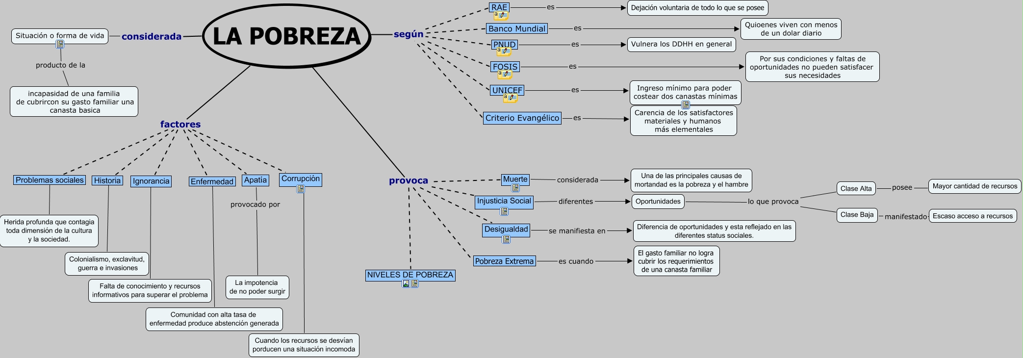 Este Cmap, tiene información relacionada con: LA POBREZA, Muerte provoca Desigualdad, Muerte provoca NIVELES DE POBREZA, LA POBREZA factores Enfermedad, Injusticia Social provoca Desigualdad, Problemas sociales factores Corrupción, LA POBREZA provoca Pobreza Extrema, Problemas sociales factores Ignorancia, LA POBREZA provoca NIVELES DE POBREZA, Injusticia Social diferentes Oportunidades, UNICEF es Ingreso mínimo para poder costear dos canastas mínimas, Enfermedad ???? Comunidad con alta tasa de enfermedad produce abstención generada, LA POBREZA factores Apatía, Ignorancia ???? Falta de conocimiento y recursos informativos para superar el problema, Historia factores Enfermedad, Muerte provoca Pobreza Extrema, Banco Mundial es Quioenes viven con menos de un dolar diario, LA POBREZA factores Corrupción, Historia ???? Colonialismo, exclavitud, guerra e invasiones, Historia factores Apatía, Criterio Evangélico es Carencia de los satisfactores materiales y humanos más elementales