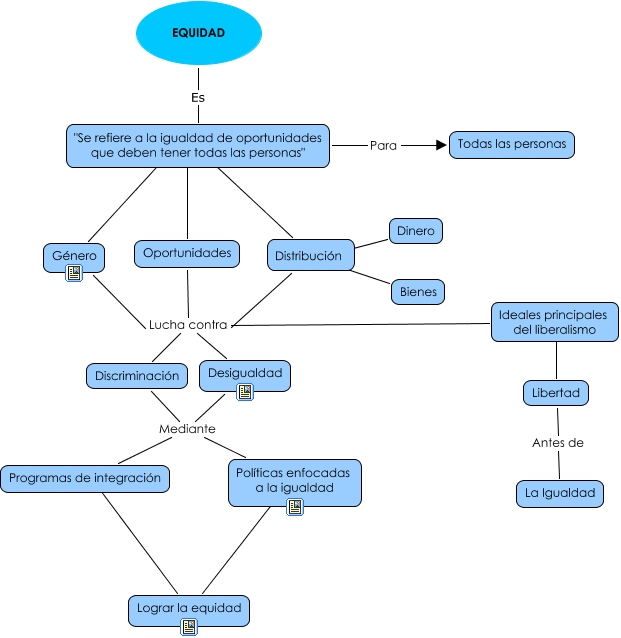 Este Cmap, tiene información relacionada con: EQUIDAD, Discriminación Mediante Programas de integración, Distribución Lucha contra Discriminación, Programas de integración ???? Lograr la equidad, "Se refiere a la igualdad de oportunidades que deben tener todas las personas" ???? Género, Discriminación Mediante Políticas enfocadas a la igualdad, Desigualdad Mediante Políticas enfocadas a la igualdad, Distribución Lucha contra Ideales principales del liberalismo, "Se refiere a la igualdad de oportunidades que deben tener todas las personas" ???? Oportunidades, "Se refiere a la igualdad de oportunidades que deben tener todas las personas" Para Todas las personas, Ideales principales del liberalismo ???? Libertad, Políticas enfocadas a la igualdad ???? Lograr la equidad, Género Lucha contra Ideales principales del liberalismo, "Se refiere a la igualdad de oportunidades que deben tener todas las personas" ???? Distribución, Oportunidades Lucha contra Desigualdad, Libertad Antes de La Igualdad, Distribución ???? Dinero, Género Lucha contra Desigualdad, Oportunidades Lucha contra Ideales principales del liberalismo, Distribución ???? Bienes, Desigualdad Mediante Programas de integración