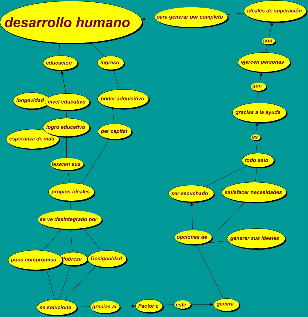 Este Cmap, tiene información relacionada con: Desarrollo humano, Desigualdad se ve desintegrado por Pobreza, generar sus ideales ???? todo esto, ser escuchado ???? todo esto, propios ideales se ve desintegrado por Pobreza, satisfacer necesidades opciones de ser escuchado, logro educativo ???? educacion, satisfacer necesidades ???? todo esto, educacion ???? desarrollo humano, se soluciona ???? poco compromiso, poder adquisitivo ???? ingreso, ingreso ???? desarrollo humano, poco compromiso se ve desintegrado por Pobreza, per capital ???? poder adquisitivo, se soluciona ???? Pobreza, generar sus ideales opciones de ser escuchado, genera opciones de ser escuchado, gracias a la ayuda que ejercen personas, logro educativo buscan sus propios ideales, logro educativo ???? educacion, per capital ???? propios ideales