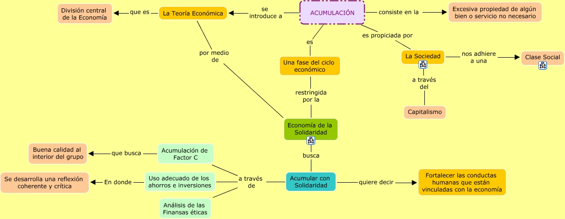 Este Cmap, tiene información relacionada con: Acumulación 001a, Una fase del ciclo económico restringida por la Economía de la Solidaridad, ACUMULACIÓN se introduce a La Teoría Económica, Acumulación de Factor C que busca Buena calidad al interior del grupo, Uso adecuado de los ahorros e inversiones En donde Se desarrolla una reflexión coherente y crítica, Acumular con Solidaridad a través de Uso adecuado de los ahorros e inversiones, Acumular con Solidaridad a través de Análisis de las Finansas éticas, Acumular con Solidaridad quiere decir Fortalecer las conductas humanas que están vinculadas con la economía, ACUMULACIÓN es Una fase del ciclo económico, Economía de la Solidaridad busca Acumular con Solidaridad, La Sociedad a través del Capitalismo, Acumular con Solidaridad a través de Acumulación de Factor C, ACUMULACIÓN consiste en la Excesiva propiedad de algún bien o servicio no necesario, La Teoría Económica por medio de Economía de la Solidaridad, ACUMULACIÓN es propiciada por La Sociedad, La Sociedad nos adhiere a una Clase Social, La Teoría Económica que es División central de la Economía