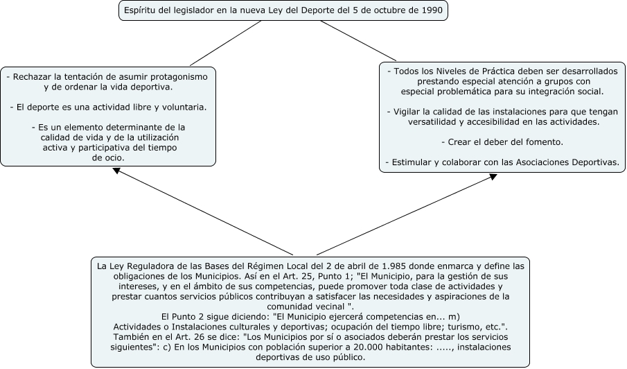 Este Cmap, tiene información relacionada con: ley del deporte del 5 de octubre de 1990, Espíritu del legislador en la nueva Ley del Deporte del 5 de octubre de 1990 ???? - Rechazar la tentación de asumir protagonismo y de ordenar la vida deportiva. - El deporte es una actividad libre y voluntaria. - Es un elemento determinante de la calidad de vida y de la utilización activa y participativa del tiempo de ocio., La Ley Reguladora de las Bases del Régimen Local del 2 de abril de 1.985 donde enmarca y define las obligaciones de los Municipios. Así en el Art. 25, Punto 1; "El Municipio, para la gestión de sus intereses, y en el ámbito de sus competencias, puede promover toda clase de actividades y prestar cuantos servicios públicos contribuyan a satisfacer las necesidades y aspiraciones de la comunidad vecinal ". El Punto 2 sigue diciendo: "El Municipio ejercerá competencias en... m) Actividades o Instalaciones culturales y deportivas; ocupación del tiempo libre; turismo, etc.". También en el Art. 26 se dice: "Los Municipios por sí o asociados deberán prestar los servicios siguientes": c) En los Municipios con población superior a 20.000 habitantes: ....., instalaciones deportivas de uso público. ???? - Todos los Niveles de Práctica deben ser desarrollados prestando especial atención a grupos con especial problemática para su integración social. - Vigilar la calidad de las instalaciones para que tengan versatilidad y accesibilidad en las actividades. - Crear el deber del fomento. - Estimular y colaborar con las Asociaciones Deportivas., Espíritu del legislador en la nueva Ley del Deporte del 5 de octubre de 1990 ???? - Todos los Niveles de Práctica deben ser desarrollados prestando especial atención a grupos con especial problemática para su integración social. - Vigilar la calidad de las instalaciones para que tengan versatilidad y accesibilidad en las actividades. - Crear el deber del fomento. - Estimular y colaborar con las Asociaciones Deportivas., La Ley Reguladora de las Bases del Régimen Local del 2 de abril de 1.985 donde enmarca y define las obligaciones de los Municipios. Así en el Art. 25, Punto 1; "El Municipio, para la gestión de sus intereses, y en el ámbito de sus competencias, puede promover toda clase de actividades y prestar cuantos servicios públicos contribuyan a satisfacer las necesidades y aspiraciones de la comunidad vecinal ". El Punto 2 sigue diciendo: "El Municipio ejercerá competencias en... m) Actividades o Instalaciones culturales y deportivas; ocupación del tiempo libre; turismo, etc.". También en el Art. 26 se dice: "Los Municipios por sí o asociados deberán prestar los servicios siguientes": c) En los Municipios con población superior a 20.000 habitantes: ....., instalaciones deportivas de uso público. ???? - Rechazar la tentación de asumir protagonismo y de ordenar la vida deportiva. - El deporte es una actividad libre y voluntaria. - Es un elemento determinante de la calidad de vida y de la utilización activa y participativa del tiempo de ocio.