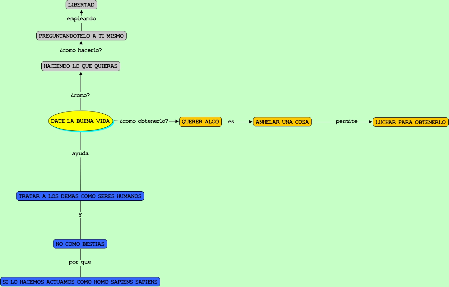 Este Cmap, tiene información relacionada con: Rodrigo 2A MC EA4, PREGUNTANDOTELO A TI MISMO empleando LIBERTAD, HACIENDO LO QUE QUIERAS ¿como hacerlo? PREGUNTANDOTELO A TI MISMO, DATE LA BUENA VIDA ayuda TRATAR A LOS DEMAS COMO SERES HUMANOS, DATE LA BUENA VIDA ¿como obtenerlo? QUERER ALGO, ANHELAR UNA COSA permite LUCHAR PARA OBTENERLO, TRATAR A LOS DEMAS COMO SERES HUMANOS Y NO COMO BESTIAS, DATE LA BUENA VIDA ¿como? HACIENDO LO QUE QUIERAS, QUERER ALGO es ANHELAR UNA COSA, NO COMO BESTIAS por que SI LO HACEMOS ACTUAMOS COMO HOMO SAPIENS SAPIENS