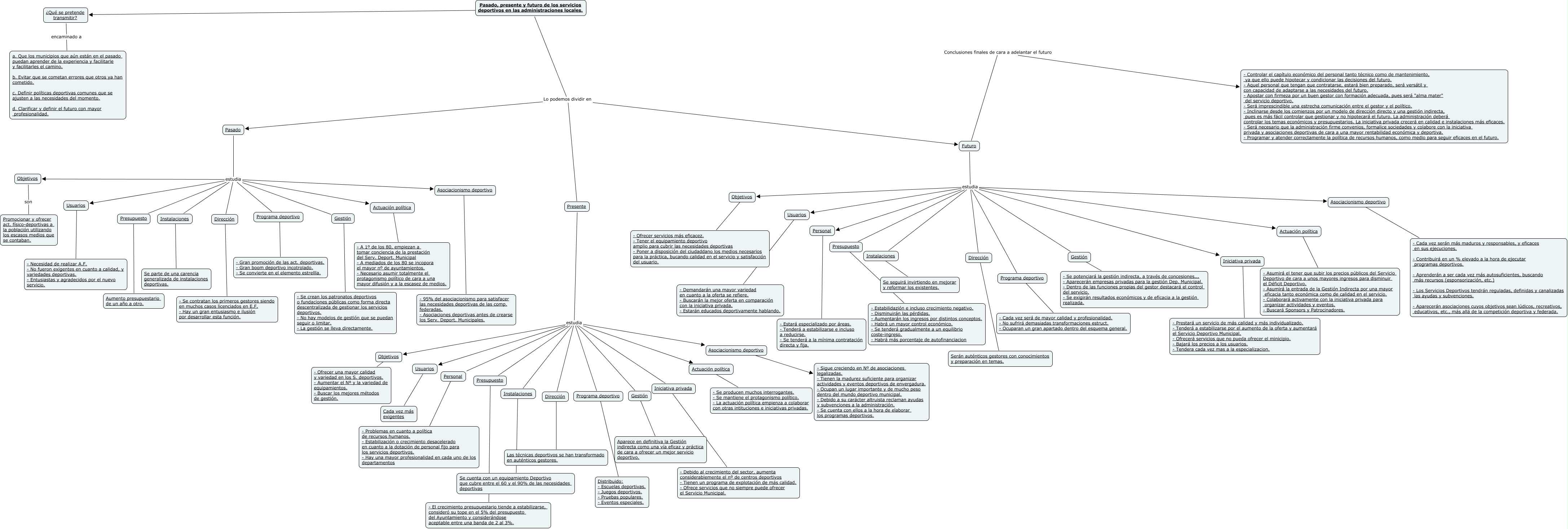 Este Cmap, tiene información relacionada con: Pasado, presente y futuro, Actuación política ???? - Se producen muchos interrogantes. - Se mantiene el protagonismo político. - La actuación política empienza a colaborar con otras intituciones e iniciativas privadas., Futuro estudia Gestión, Presente estudia Instalaciones, Pasado estudia Actuación política, Actuación política ???? - A 1º de los 80, empiezan a tomar conciencia de la prestación del Serv. Deport. Municipal - A mediados de los 80 se incopora el mayor nº de ayuntamientos. - Necesario asumir totalmente el protagonismo político de cara a una mayor difusión y a la escasez de medios., Instalaciones ???? Se cuenta con un equipamiento Deportivo que cubre entre el 60 y el 90% de las necesidades deportivas, Pasado estudia Programa deportivo, Usuarios ???? - Necesidad de realizar A.F. - No fueron exigentes en cuanto a calidad, y variedades deportivas. - Entusiastas y agradecidos por el nuevo servicio., Pasado, presente y futuro de los servicios deportivos en las administraciones locales. ???? ¿Qué se pretende transmitir?, Instalaciones ???? Se seguirá invirtiendo en mejorar y reformar los existentes., Gestión ???? - Se potenciará la gestión indirecta, a través de concesiones... - Aparecerán empresas privadas para la gestión Dep. Municipal. - Dentro de las funciones propias del gestor destacará el control del servicio. - Se exigirán resultados económicos y de eficacia a la gestión realizada., Programa deportivo ???? - Cada vez será de mayor calidad y profesionalidad. - No sufrirá demasiadas transformaciones estruct. - Ocuparan un gran apartado dentro del esquema general., Dirección ???? Las técnicas deportivos se han transformado en auténticos gestores., Iniciativa privada ???? - Prestará un servicio de más calidad y más individualizado. - Tenderá a estabilizarse por el aumento de la oferta y aumentará el Servicio Deportivo Municipal. - Ofrecerá servicios que no pueda ofrecer el minicipio. - Bajará los precios a los usuarios. - Tendera cada vez mas a la especializacion., Futuro estudia Usuarios, Presupuesto ???? - Estabilidazión e incluso crecimiento negativo. - Disminuirán las pérdidas. - Aumentarán los ingresos por distintos conceptos. - Habrá un mayor control económico. - Se tenderá gradualmente a un equilibrio coste-ingreso. - Habrá más porcentaje de autofinanciacion, Presente estudia Actuación política, Presente estudia Iniciativa privada, Presente estudia Programa deportivo, Pasado estudia Asociacionismo deportivo
