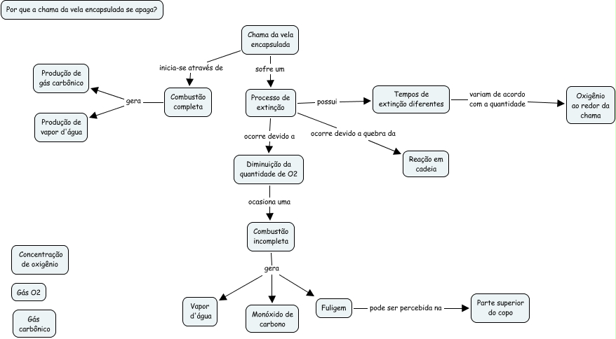 Esse mapa conceitual, produzido no IHMC CmapTools, tem a informação relacionada a: Chama de vela Dani, Chama da vela encapsulada inicia-se através de Combustão completa, Combustão incompleta gera Fuligem, Combustão incompleta gera Vapor d'água, Processo de extinção ocorre devido a quebra da Reação em cadeia, Processo de extinção ocorre devido a Diminuição da quantidade de O2, Combustão completa gera Produção de vapor d'água, Combustão completa gera Produção de gás carbônico, Chama da vela encapsulada sofre um Processo de extinção, Tempos de extinção diferentes variam de acordo com a quantidade Oxigênio ao redor da chama, Fuligem pode ser percebida na Parte superior do copo, Diminuição da quantidade de O2 ocasiona uma Combustão incompleta, Processo de extinção possui Tempos de extinção diferentes, Combustão incompleta gera Monóxido de carbono