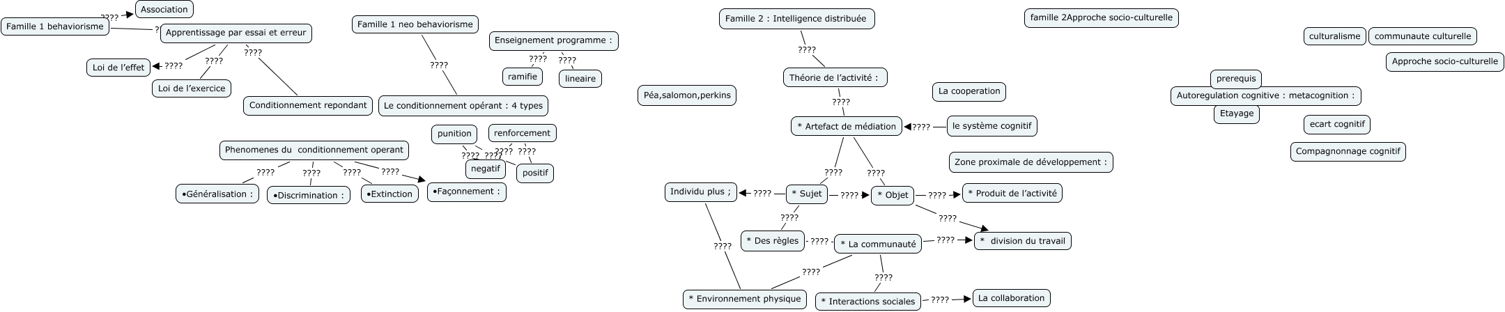 Este Cmap, tiene información relacionada con: carte conceptuelle famille, Phenomenes du conditionnement operant ???? • Façonnement :, punition ???? positif, Apprentissage par essai et erreur ???? Conditionnement repondant, Famille 1 neo behaviorisme ???? Le conditionnement opérant : 4 types, * Interactions sociales ???? La collaboration, Enseignement programme : ???? ramifie, * Sujet ???? * Objet, Individu plus ; ???? * Environnement physique, * Artefact de médiation ???? * Sujet, Apprentissage par essai et erreur ???? Loi de l’effet, le système cognitif ???? * Artefact de médiation, Famille 2 : Intelligence distribuée ???? Théorie de l’activité :, Apprentissage par essai et erreur ???? Loi de l’exercice, * Objet ???? * Produit de l’activité, * Sujet ???? * Des règles, * La communauté ???? * Environnement physique, renforcement ???? negatif, * Des règles ???? * La communauté, Phenomenes du conditionnement operant ???? • Discrimination :, * Artefact de médiation ???? * Objet