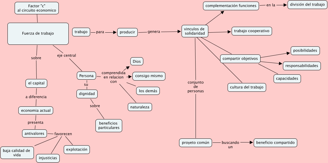 Este Cmap, tiene información relacionada con: fuerza de trabajo, complementación funciones en la división del trabajo, antivalores favorecen explotación, vinculos de solidaridad ???? cultura del trabajo, Factor "c" al circuito economico ???? Fuerza de trabajo, Persona comprendida en relacion con Dios, compartir objetivos ???? responsabilidades, Persona comprendida en relacion con consigo mismo, dignidad sobre beneficios particulares, Persona comprendida en relacion con los demás, economia actual presenta antivalores, proyeto común buscando un beneficio compartido, producir genera vinculos de solidaridad, vinculos de solidaridad ???? complementación funciones, compartir objetivos ???? capacidades, vinculos de solidaridad conjunto de personas proyeto común, Persona comprendida en relacion con naturaleza, trabajo para producir, Fuerza de trabajo sobre el capital, antivalores favorecen baja calidad de vida, vinculos de solidaridad ???? trabajo cooperativo