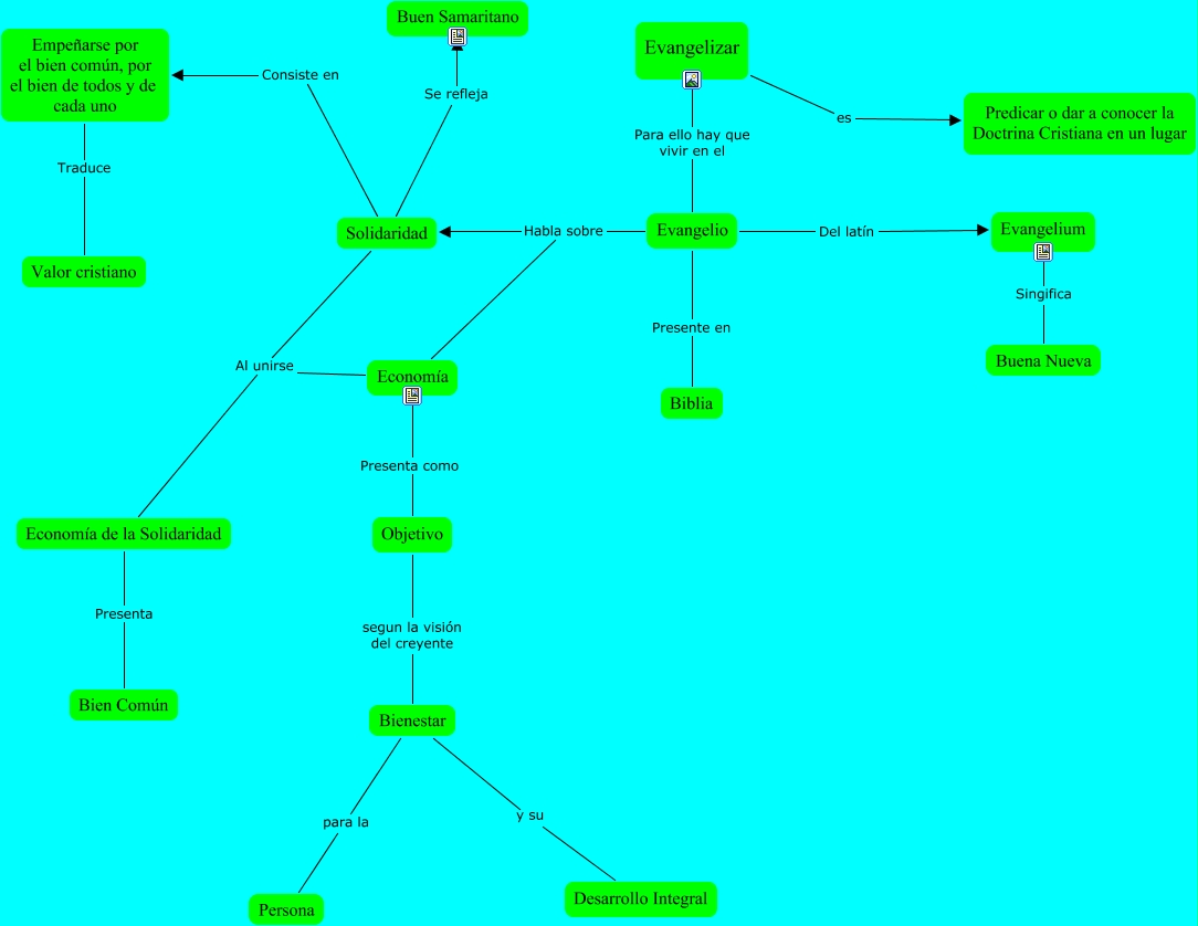 Este Cmap, tiene información relacionada con: Evangelio, Evangelio Habla sobre Economía, Solidaridad Al unirse Economía de la Solidaridad, Economía Al unirse Economía de la Solidaridad, Evangelizar Para ello hay que vivir en el Evangelio, Solidaridad Consiste en Empeñarse por el bien común, por el bien de todos y de cada uno, Evangelio Del latín Evangelium, Empeñarse por el bien común, por el bien de todos y de cada uno Traduce Valor cristiano, Solidaridad Se refleja Buen Samaritano, Evangelio Habla sobre Solidaridad, Bienestar para la Persona, Evangelio Presente en Biblia, Economía de la Solidaridad Presenta Bien Común, Bienestar y su Desarrollo Integral, Evangelium Singifica Buena Nueva, Evangelizar es Predicar o dar a conocer la Doctrina Cristiana en un lugar, Economía Presenta como Objetivo, Objetivo segun la visión del creyente Bienestar