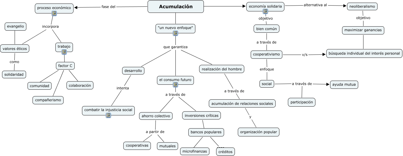 Este Cmap, tiene información relacionada con: acumulacón, factor C ???? colaboración, social a través de ayuda mutua, "un nuevo enfoque" que garantiza el consumo futuro, Acumulación fase del proceso económico, maximizar ganancias ???? búsqueda individual del interés personal, social a través de participación, realización del hombre a través de acumulación de relaciones sociales, inversiones críticas ???? bancos populares, "un nuevo enfoque" que garantiza realización del hombre, el consumo futuro a través de inversiones críticas, factor C ???? compañerismo, economía solidaria objetivo bien común, bien común a través de cooperativismo, proceso económico incorpora valores éticos, bancos populares ???? créditos, Acumulación ???? "un nuevo enfoque", el consumo futuro a través de ahorro colectivo, factor C ???? comunidad, ahorro colectivo a partir de mutuales, trabajo ???? factor C