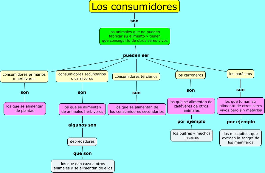 Este Cmap, tiene información relacionada con: Los consumidores, consumidores primarios o herbívoros son los que se alimentan de plantas, consumidores secundarios o carnivoros son los que se alimentan de animales herbívoros, los animales que no pueden fabricar su alimento y tienen que conseguirlo de otros seres vivos pueden ser los carroñeros, los que se alimentan de cadáveres de otros animales por ejemplo los buitres y muchos insectos, Los consumidores son los animales que no pueden fabricar su alimento y tienen que conseguirlo de otros seres vivos, los carroñeros son los que se alimentan de cadáveres de otros animales, consumidores terciarios son los que se alimentan de los consumidores secundarios, los parásitos son los que toman su alimento de otros seres vivos pero sin matarlos, los animales que no pueden fabricar su alimento y tienen que conseguirlo de otros seres vivos pueden ser consumidores secundarios o carnivoros, depredadores que son los que dan caza a otros animales y se alimentan de ellos, los que toman su alimento de otros seres vivos pero sin matarlos por ejemplo los mosquitos, que extraen la sangre de los mamíferos, los animales que no pueden fabricar su alimento y tienen que conseguirlo de otros seres vivos pueden ser consumidores terciarios, los que se alimentan de animales herbívoros algunos son depredadores, los animales que no pueden fabricar su alimento y tienen que conseguirlo de otros seres vivos pueden ser los parásitos, los animales que no pueden fabricar su alimento y tienen que conseguirlo de otros seres vivos pueden ser consumidores primarios o herbívoros