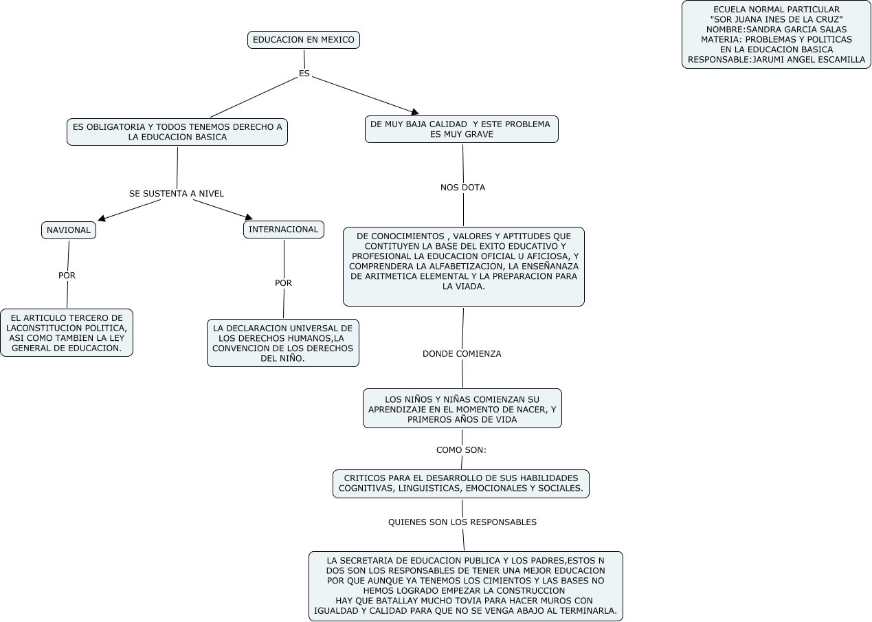Este Cmap, tiene información relacionada con: EDUCACION EN MEXICO, CRITICOS PARA EL DESARROLLO DE SUS HABILIDADES COGNITIVAS, LINGUISTICAS, EMOCIONALES Y SOCIALES. QUIENES SON LOS RESPONSABLES LA SECRETARIA DE EDUCACION PUBLICA Y LOS PADRES,ESTOS N DOS SON LOS RESPONSABLES DE TENER UNA MEJOR EDUCACION POR QUE AUNQUE YA TENEMOS LOS CIMIENTOS Y LAS BASES NO HEMOS LOGRADO EMPEZAR LA CONSTRUCCION HAY QUE BATALLAY MUCHO TOVIA PARA HACER MUROS CON IGUALDAD Y CALIDAD PARA QUE NO SE VENGA ABAJO AL TERMINARLA., DE CONOCIMIENTOS , VALORES Y APTITUDES QUE CONTITUYEN LA BASE DEL EXITO EDUCATIVO Y PROFESIONAL LA EDUCACION OFICIAL U AFICIOSA, Y COMPRENDERA LA ALFABETIZACION, LA ENSEÑANAZA DE ARITMETICA ELEMENTAL Y LA PREPARACION PARA LA VIADA. DONDE COMIENZA LOS NIÑOS Y NIÑAS COMIENZAN SU APRENDIZAJE EN EL MOMENTO DE NACER, Y PRIMEROS AÑOS DE VIDA, NAVIONAL POR EL ARTICULO TERCERO DE LACONSTITUCION POLITICA, ASI COMO TAMBIEN LA LEY GENERAL DE EDUCACION., ES OBLIGATORIA Y TODOS TENEMOS DERECHO A LA EDUCACION BASICA SE SUSTENTA A NIVEL NAVIONAL, EDUCACION EN MEXICO ES ES OBLIGATORIA Y TODOS TENEMOS DERECHO A LA EDUCACION BASICA, INTERNACIONAL POR LA DECLARACION UNIVERSAL DE LOS DERECHOS HUMANOS,LA CONVENCION DE LOS DERECHOS DEL NIÑO., EDUCACION EN MEXICO ES DE MUY BAJA CALIDAD Y ESTE PROBLEMA ES MUY GRAVE, ES OBLIGATORIA Y TODOS TENEMOS DERECHO A LA EDUCACION BASICA SE SUSTENTA A NIVEL INTERNACIONAL, LOS NIÑOS Y NIÑAS COMIENZAN SU APRENDIZAJE EN EL MOMENTO DE NACER, Y PRIMEROS AÑOS DE VIDA COMO SON: CRITICOS PARA EL DESARROLLO DE SUS HABILIDADES COGNITIVAS, LINGUISTICAS, EMOCIONALES Y SOCIALES., DE MUY BAJA CALIDAD Y ESTE PROBLEMA ES MUY GRAVE NOS DOTA DE CONOCIMIENTOS , VALORES Y APTITUDES QUE CONTITUYEN LA BASE DEL EXITO EDUCATIVO Y PROFESIONAL LA EDUCACION OFICIAL U AFICIOSA, Y COMPRENDERA LA ALFABETIZACION, LA ENSEÑANAZA DE ARITMETICA ELEMENTAL Y LA PREPARACION PARA LA VIADA.