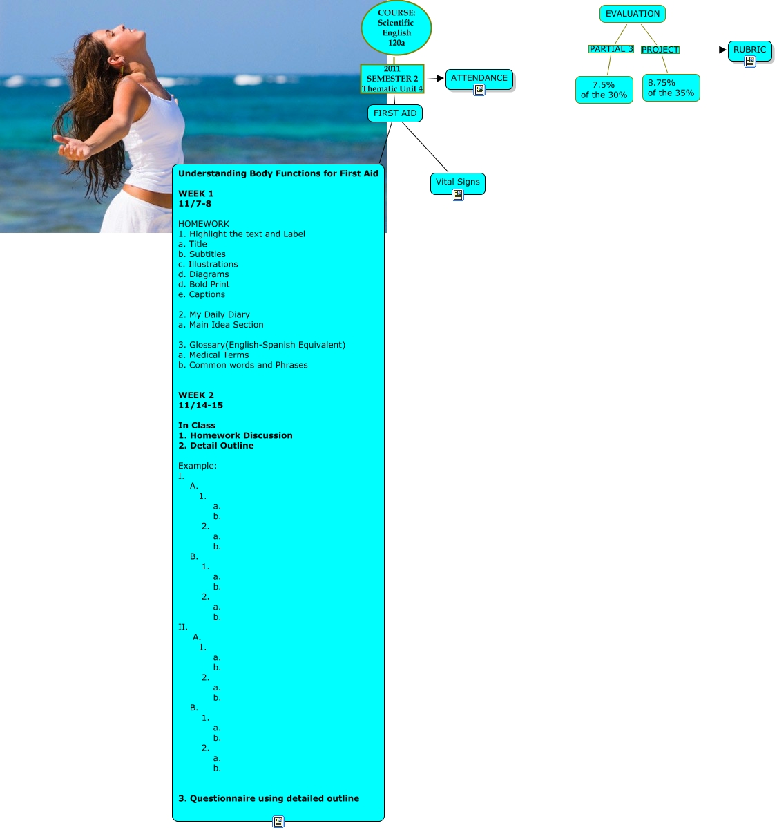Este Cmap, tiene información relacionada con: THEMATIC UNIT 4, COURSE: Scientific English 120a 2011 SEMESTER 2 Thematic Unit 4 FIRST AID, COURSE: Scientific English 120a 2011 SEMESTER 2 Thematic Unit 4 ATTENDANCE, EVALUATION PROJECT 8.75% of the 35%, EVALUATION PROJECT RUBRIC, Vital Signs ???? FIRST AID, EVALUATION PARTIAL 3 7.5% of the 30%, Understanding Body Functions for First Aid WEEK 1 11/7-8 HOMEWORK 1. Highlight the text and Label a. Title b. Subtitles c. Illustrations d. Diagrams d. Bold Print e. Captions 2. My Daily Diary a. Main Idea Section 3. Glossary(English-Spanish Equivalent) a. Medical Terms b. Common words and Phrases WEEK 2 11/14-15 In Class 1. Homework Discussion 2. Detail Outline Example: I. A. 1. a. b. 2. a. b. B. 1. a. b. 2. a. b. II. A. 1. a. b. 2. a. b. B. 1. a. b. 2. a. b. 3. Questionnaire using detailed outline ???? FIRST AID