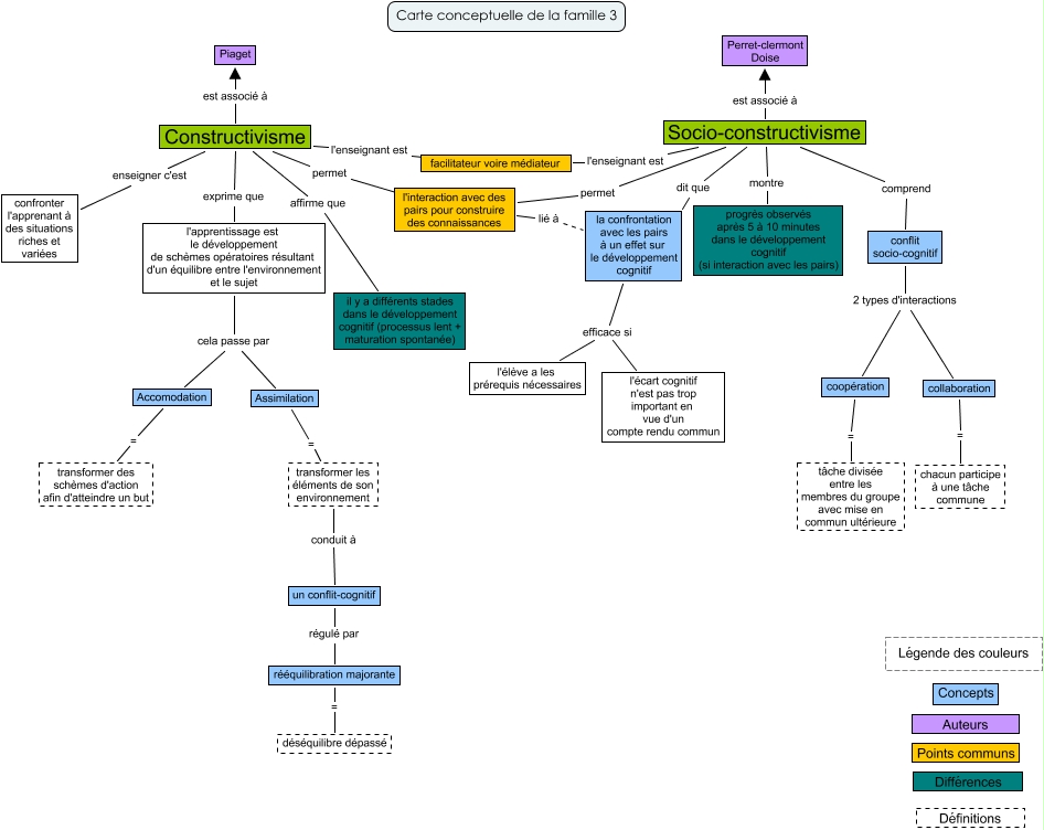 Cette carte de concepts créée avec IHMC CmapTools traite de: carte conceptuelle Famille n°3, la confrontation avec les pairs à un effet sur le développement cognitif efficace si l'élève a les prérequis nécessaires, Constructivisme enseigner c'est confronter l'apprenant à des situations riches et variées, Socio-constructivisme montre progrès observés après 5 à 10 minutes dans le développement cognitif (si interaction avec les pairs), Constructivisme exprime que l'apprentissage est le développement de schèmes opératoires résultant d'un équilibre entre l'environnement et le sujet, Constructivisme affirme que il y a différents stades dans le développement cognitif (processus lent + maturation spontanée), la confrontation avec les pairs à un effet sur le développement cognitif efficace si l'écart cognitif n'est pas trop important en vue d'un compte rendu commun, Socio-constructivisme dit que la confrontation avec les pairs à un effet sur le développement cognitif, l'apprentissage est le développement de schèmes opératoires résultant d'un équilibre entre l'environnement et le sujet cela passe par Assimilation, l'interaction avec des pairs pour construire des connaissances lié à la confrontation avec les pairs à un effet sur le développement cognitif, rééquilibration majorante = déséquilibre dépassé, collaboration = chacun participe à une tâche commune, transformer les éléments de son environnement conduit à un conflit-cognitif, Socio-constructivisme l'enseignant est facilitateur voire médiateur, Constructivisme est associé à Piaget, conflit socio-cognitif 2 types d'interactions coopération, un conflit-cognitif régulé par rééquilibration majorante, Constructivisme permet l'interaction avec des pairs pour construire des connaissances, l'apprentissage est le développement de schèmes opératoires résultant d'un équilibre entre l'environnement et le sujet cela passe par Accomodation, Constructivisme l'enseignant est facilitateur voire médiateur, Assimilation = transformer les éléments de son environnement