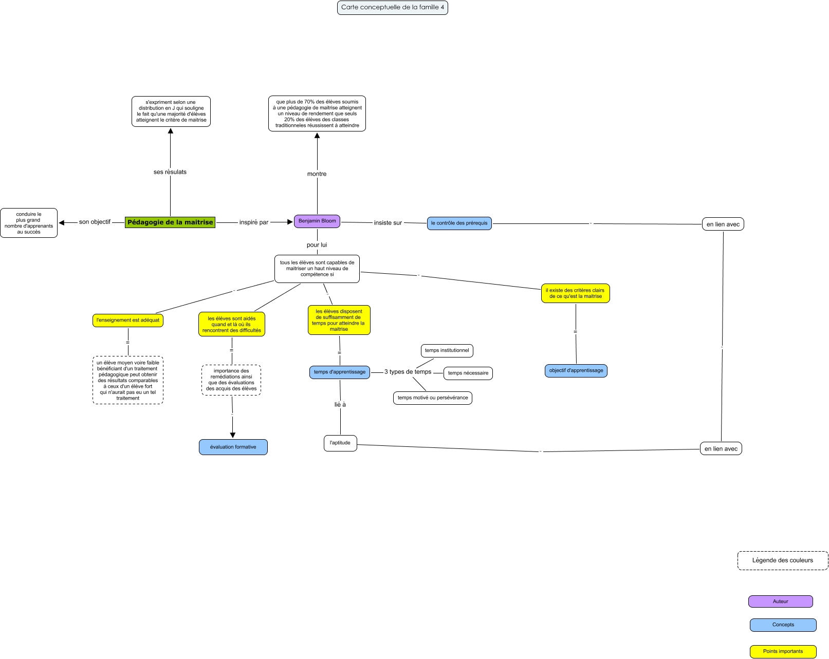 Cette carte de concepts créée avec IHMC CmapTools traite de: carte conceptuelle Famille n°4, les élèves disposent de suffisamment de temps pour atteindre la maitrise = temps d'apprentissage, tous les élèves sont capables de maitriser un haut niveau de compétence si ???? les élèves sont aidés quand et là où ils rencontrent des difficultés, les élèves sont aidés quand et là où ils rencontrent des difficultés = importance des remédiations ainsi que des évaluations des acquis des élèves, tous les élèves sont capables de maitriser un haut niveau de compétence si . l'enseignement est adéquat, Benjamin Bloom insiste sur le contrôle des prérequis, temps d'apprentissage lié à l'aptitude, temps d'apprentissage 3 types de temps temps nécessaire, l'enseignement est adéquat = un élève moyen voire faible bénéficiant d'un traitement pédagogique peut obtenir des résultats comparables à ceux d'un élève fort qui n'aurait pas eu un tel traitement, Benjamin Bloom montre que plus de 70% des élèves soumis à une pédagogie de maitrise atteignent un niveau de rendement que seuls 20% des élèves des classes traditionneles réussissent à atteindre, Pédagogie de la maitrise ses résulats s'expriment selon une distribution en J qui souligne le fait qu'une majorité d'élèves atteignent le critère de maitrise, Pédagogie de la maitrise inspiré par Benjamin Bloom, le contrôle des prérequis . en lien avec, en lien avec . en lien avec, tous les élèves sont capables de maitriser un haut niveau de compétence si . les élèves disposent de suffisamment de temps pour atteindre la maitrise, tous les élèves sont capables de maitriser un haut niveau de compétence si . il existe des critères clairs de ce qu'est la maitrise, Benjamin Bloom pour lui tous les élèves sont capables de maitriser un haut niveau de compétence si, temps d'apprentissage 3 types de temps temps motivé ou persévérance, en lien avec . ????, Pédagogie de la maitrise son objectif conduire le plus grand nombre d'apprenants au succès, importance des remédiations ainsi que des évaluations des acquis des élèves . évaluation formative