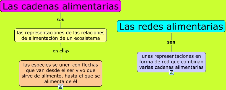 Este Cmap, tiene información relacionada con: Cadenas y redes alimentarias, Las cadenas alimentarias son las representaciones de las relaciones de alimentación de un ecosistema, Las redes alimentarias son unas representaciones en forma de red que combinan varias cadenas alimentarias, las representaciones de las relaciones de alimentación de un ecosistema en ellas las especies se unen con flechas que van desde el ser vivo que sirve de alimento, hasta el que se alimenta de él