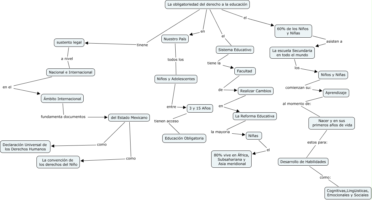 Este Cmap, tiene información relacionada con: La Educacion, Desarrollo de Habilidades como: Cognitivas,Lingüisticas, Emocionales y Sociales, Nacional e Internacional en el Ámbito Internacional, Aprendizaje al momento de: Nacer y en sus primeros años de vida, Niños y Niñas comienzan su: Aprendizaje, sustento legal a nivel Nacional e Internacional, La obligatoriedad del derecho a la educación en Nuestro País, La Reforma Educativa la mayoria Niñas, Niños y Adolescentes entre 3 y 15 Años, Nuestro País todos los Niños y Adolescentes, Realizar Cambios en La Reforma Educativa, 3 y 15 Años tienen acceso Educación Obligatoria, La escuela Secundaria en todo el mundo los Niños y Niñas, Ámbito Internacional fundamenta documentos del Estado Mexicano, Niñas el 80% vive en África, Subsahariana y Asia meridional, Sistema Educativo tiene la Facultad, La obligatoriedad del derecho a la educación el Sistema Educativo, del Estado Mexicano como Declaración Universal de los Derechos Humanos, La obligatoriedad del derecho a la educación el 60% de los Niños y Niñas, 60% de los Niños y Niñas asisten a La escuela Secundaria en todo el mundo, Facultad de Realizar Cambios