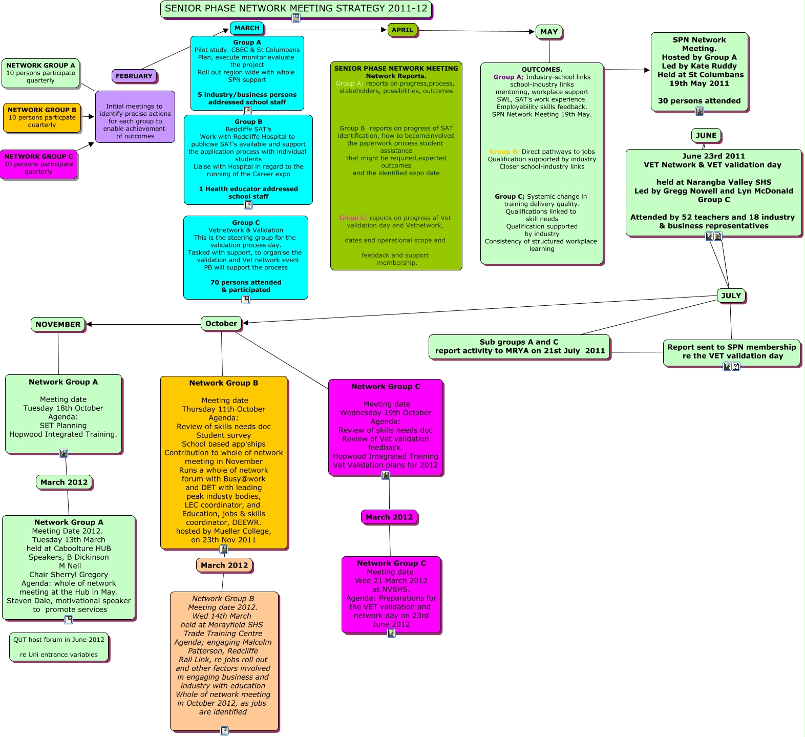 This Concept Map, created with IHMC CmapTools, has information related to: Senior Phase Network meeting strategy, MAY ???? OUTCOMES. Group A; Industry-school links school-industry links mentoring, workplace support SWL, SAT's work experience. Employability skills feedback. SPN Network Meeting 19th May. Group B; Direct pathways to jobs Qualification supported by industry Closer school-industry links Group C; Systemic change in training delivery quality. Qualifications linked to skill needs Qualification supported by industry Consistency of structured workplace learning, October ???? Network Group B Meeting date Thursday 11th October Agenda: Review of skills needs doc Student survey School based app'ships Contribution to whole of network meeting in November Runs a whole of network forum with Busy@work and DET with leading peak industy bodies, LEC coordinator, and Education, jobs & skills coordinator, DEEWR. hosted by Mueller College, on 23th Nov 2011, March 2012 ???? Network Group C Meeting date Wed 21 March 2012 at NVSHS. Agenda: Preparations for the VET validation and network day on 23rd June 2012, March 2012 ???? Network Group C Meeting date Wed 21 March 2012 at NVSHS. Agenda: Preparations for the VET validation and network day on 23rd June 2012, October ???? NOVEMBER, NOVEMBER ???? Network Group A Meeting date Tuesday 18th October Agenda: SET Planning Hopwood Integrated Training., NETWORK GROUP A 10 persons participate quarterly ???? Initial meetings to identify precise actions for each group to enable achievement of outcomes, JULY ???? October, APRIL ???? MAY, March 2012 ???? Network Group B Meeting date 2012. Wed 14th March held at Morayfield SHS Trade Training Centre Agenda; engaging Malcolm Patterson, Redcliffe Rail Link, re jobs roll out and other factors involved in engaging business and industry with education Whole of network meeting in October 2012, as jobs are identified, June 23rd 2011 VET Network & VET validation day held at Narangba Valley SHS Led by Gregg Nowell and Lyn McDonald Group C Attended by 52 teachers and 18 industry & business representatives ???? Report sent to SPN membership re the VET validation day, FEBRUARY ???? MARCH, JUNE ???? JULY, Network Group A Meeting date Tuesday 18th October Agenda: SET Planning Hopwood Integrated Training. ???? Network Group A Meeting Date 2012. Tuesday 13th March held at Caboolture HUB Speakers, B Dickinson M Neil Chair Sherryl Gregory Agenda: whole of network meeting at the Hub in May. Steven Dale, motivational speaker to promote services, NOVEMBER ???? Network Group A Meeting date Tuesday 18th October Agenda: SET Planning Hopwood Integrated Training., JUNE ???? June 23rd 2011 VET Network & VET validation day held at Narangba Valley SHS Led by Gregg Nowell and Lyn McDonald Group C Attended by 52 teachers and 18 industry & business representatives, Network Group C Meeting date Wednesday 19th October Agenda: Review of skills needs doc Review of Vet validation feedback. Hopwood Integrated Training Vet Validation plans for 2012 ???? March 2012, Network Group B Meeting date Thursday 11th October Agenda: Review of skills needs doc Student survey School based app'ships Contribution to whole of network meeting in November Runs a whole of network forum with Busy@work and DET with leading peak industy bodies, LEC coordinator, and Education, jobs & skills coordinator, DEEWR. hosted by Mueller College, on 23th Nov 2011 ???? March 2012, NETWORK GROUP B 10 persons particpate quarterly ???? Initial meetings to identify precise actions for each group to enable achievement of outcomes, October ???? Network Group C Meeting date Wednesday 19th October Agenda: Review of skills needs doc Review of Vet validation feedback. Hopwood Integrated Training Vet Validation plans for 2012