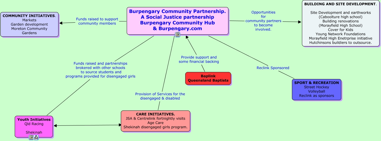 This Concept Map, created with IHMC CmapTools, has information related to: Burpengary Community Paertnership, Youth Initiatives Qld Racing Shekinah ???? CARE INITIATIVES. JSA & Centrelink fortnightly visits Age Care Shekinah disengaged girls program., Burpengary Community Partnership. A Social Justice partnership Burpengary Community Hub & Burpengary.com Opportunities for community partners to become involved. BUILDING AND SITE DEVELOPMENT. Site Development and earthworks (Caboolture high school) Building renovations (Morayfield High School) Cover for Kids Young Network Foundations Morayfield High Enetrprise initiative Hutchinsons buildiers to outsource., Burpengary Community Partnership. A Social Justice partnership Burpengary Community Hub & Burpengary.com Reclink Sponsored SPORT & RECREATION Street Hockey Volleyball Reclink as sponsors, Burpengary Community Partnership. A Social Justice partnership Burpengary Community Hub & Burpengary.com Funds raised to support community members COMMUNITY INITIATIVES. Markets Garden development Moreton Community Gardens, Burpengary Community Partnership. A Social Justice partnership Burpengary Community Hub & Burpengary.com Funds raised and partnerships brokered with other schools to source students and programs provided for disengaged girls Youth Initiatives Qld Racing Shekinah, Baplink Queensland Baptists Provide support and some financial backing Burpengary Community Partnership. A Social Justice partnership Burpengary Community Hub & Burpengary.com, Burpengary Community Partnership. A Social Justice partnership Burpengary Community Hub & Burpengary.com Provision of Services for the disengaged & disabled CARE INITIATIVES. JSA & Centrelink fortnightly visits Age Care Shekinah disengaged girls program.
