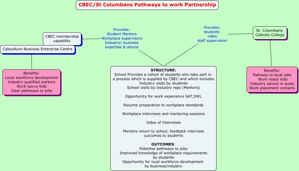 This Concept Map, created with IHMC CmapTools, has information related to: CBEC-St C's partnership, St. Columbans Catholic College ???? Benefits: Pathway to local jobs Work ready kids Industry advice re quals Work placement contacts, Caboolture Business Enterprise Centre ???? Benefits: Local workforce development Industry qualified workers Work-savvy kids Clear pathways to jobs, CBEC membership capability Provides: Student Mentors Workplace supervisors Industry/ business expertise & advice STRUCTURE: School Provides a cohort of students who take part in a process which is supplied by CBEC and which includes Industry visits by students School visits by Industry reps (Mentors) Opportunity for work experience SAT,SWL Resume preparation to workplace standards Workplace interviews and mentoring sessions Video of interviews Mentors return to school, feedback interview outcomes to students OUTCOMES: Potential pathways to jobs Improved knowledge of workplace requirements by students Opportunity for local workforce development by business/industry, St. Columbans Catholic College Provides: students video staff supervision STRUCTURE: School Provides a cohort of students who take part in a process which is supplied by CBEC and which includes Industry visits by students School visits by Industry reps (Mentors) Opportunity for work experience SAT,SWL Resume preparation to workplace standards Workplace interviews and mentoring sessions Video of interviews Mentors return to school, feedback interview outcomes to students OUTCOMES: Potential pathways to jobs Improved knowledge of workplace requirements by students Opportunity for local workforce development by business/industry