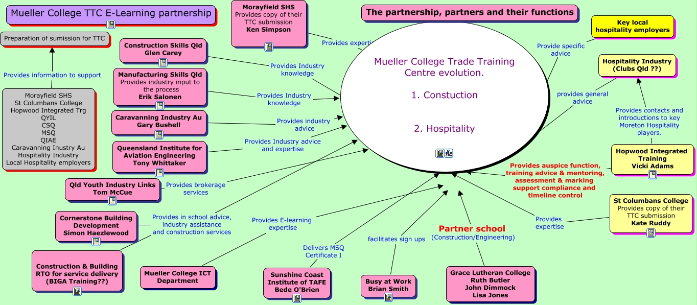 This Concept Map, created with IHMC CmapTools, has information related to: Mueller College Trade Training centre E-learning Partnership, Construction Skills Qld Glen Carey Provides Industry knowledge Mueller College Trade Training Centre evolution. 1. Constuction 2. Hospitality, Manufacturing Skills Qld Provides industry input to the process Erik Salonen Provides Industry knowledge Mueller College Trade Training Centre evolution. 1. Constuction 2. Hospitality, Qld Youth Industry Links Tom McCue Provides brokerage services Mueller College Trade Training Centre evolution. 1. Constuction 2. Hospitality, Caravanning Industry Au Gary Bushell Provides industry advice Mueller College Trade Training Centre evolution. 1. Constuction 2. Hospitality, Hopwood Integrated Training Vicki Adams Provides contacts and introductions to key Moreton Hospitality players. Hospitality Industry (Clubs Qld ??), Sunshine Coast Institute of TAFE Bede O'Brien Delivers MSQ Certificate I Mueller College Trade Training Centre evolution. 1. Constuction 2. Hospitality, Construction & Building RTO for service delivery (BIGA Training??) Provides in school advice, industry assistance and construction services Mueller College Trade Training Centre evolution. 1. Constuction 2. Hospitality, Busy at Work Brian Smith facilitates sign ups ????, Mueller College ICT Department Provides E-learning expertise ????, Grace Lutheran College Ruth Butler John Dimmock Lisa Jones Partner school (Construction/Engineering) ????, Hospitality Industry (Clubs Qld ??) provides general advice Mueller College Trade Training Centre evolution. 1. Constuction 2. Hospitality, Morayfield SHS Provides copy of their TTC submission Ken Simpson Provides expertise Mueller College Trade Training Centre evolution. 1. Constuction 2. Hospitality, Morayfield SHS St Columbans College Hopwood Integrated Trg QYIL CSQ MSQ QIAE Caravanning Inustry Au Hospitality Industry Local Hospitality employers Provides information to support Preparation of sumission for TTC, Cornerstone Building Development Simon Haezlewood Provides in school advice, industry assistance and construction services Mueller College Trade Training Centre evolution. 1. Constuction 2. Hospitality, Queensland Institute for Aviation Engineering Tony Whittaker Provides Industry advice and expertise Mueller College Trade Training Centre evolution. 1. Constuction 2. Hospitality, St Columbans College Provides copy of their TTC submission Kate Ruddy Provides expertise Mueller College Trade Training Centre evolution. 1. Constuction 2. Hospitality, Key local hospitality employers Provide specific advice Mueller College Trade Training Centre evolution. 1. Constuction 2. Hospitality, Hopwood Integrated Training Vicki Adams Provides auspice function, training advice & mentoring, assessment & marking support compliance and timeline control Mueller College Trade Training Centre evolution. 1. Constuction 2. Hospitality