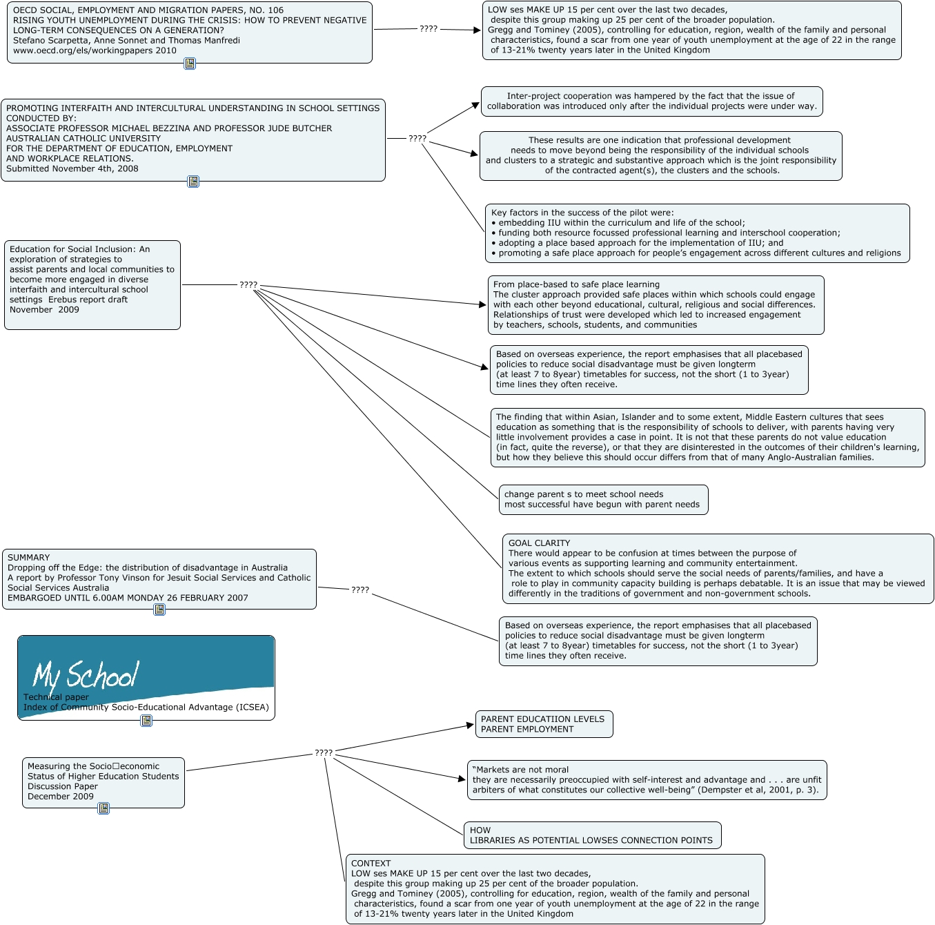 This Concept Map, created with IHMC CmapTools, has information related to: Cross cultural safe place interventions, Education for Social Inclusion: An exploration of strategies to assist parents and local communities to become more engaged in diverse interfaith and intercultural school settings Erebus report draft November 2009 ???? change parent s to meet school needs most successful have begun with parent needs, Education for Social Inclusion: An exploration of strategies to assist parents and local communities to become more engaged in diverse interfaith and intercultural school settings Erebus report draft November 2009 ???? From place-based to safe place learning The cluster approach provided safe places within which schools could engage with each other beyond educational, cultural, religious and social differences. Relationships of trust were developed which led to increased engagement by teachers, schools, students, and communities, PROMOTING INTERFAITH AND INTERCULTURAL UNDERSTANDING IN SCHOOL SETTINGS CONDUCTED BY: ASSOCIATE PROFESSOR MICHAEL BEZZINA AND PROFESSOR JUDE BUTCHER AUSTRALIAN CATHOLIC UNIVERSITY FOR THE DEPARTMENT OF EDUCATION, EMPLOYMENT AND WORKPLACE RELATIONS. Submitted November 4th, 2008 ???? Key factors in the success of the pilot were: • embedding IIU within the curriculum and life of the school; • funding both resource focussed professional learning and interschool cooperation; • adopting a place based approach for the implementation of IIU; and • promoting a safe place approach for people’s engagement across different cultures and religions, PROMOTING INTERFAITH AND INTERCULTURAL UNDERSTANDING IN SCHOOL SETTINGS CONDUCTED BY: ASSOCIATE PROFESSOR MICHAEL BEZZINA AND PROFESSOR JUDE BUTCHER AUSTRALIAN CATHOLIC UNIVERSITY FOR THE DEPARTMENT OF EDUCATION, EMPLOYMENT AND WORKPLACE RELATIONS. Submitted November 4th, 2008 ???? Inter-project cooperation was hampered by the fact that the issue of collaboration was introduced only after the individual projects were under way., Measuring the Socio‐economic Status of Higher Education Students Discussion Paper December 2009 ???? “Markets are not moral they are necessarily preoccupied with self-interest and advantage and . . . are unfit arbiters of what constitutes our collective well-being” (Dempster et al, 2001, p. 3)., Measuring the Socio‐economic Status of Higher Education Students Discussion Paper December 2009 ???? PARENT EDUCATIION LEVELS PARENT EMPLOYMENT, Measuring the Socio‐economic Status of Higher Education Students Discussion Paper December 2009 ???? HOW LIBRARIES AS POTENTIAL LOWSES CONNECTION POINTS, Education for Social Inclusion: An exploration of strategies to assist parents and local communities to become more engaged in diverse interfaith and intercultural school settings Erebus report draft November 2009 ???? GOAL CLARITY There would appear to be confusion at times between the purpose of various events as supporting learning and community entertainment. The extent to which schools should serve the social needs of parents/families, and have a role to play in community capacity building is perhaps debatable. It is an issue that may be viewed differently in the traditions of government and non-government schools., OECD SOCIAL, EMPLOYMENT AND MIGRATION PAPERS, NO. 106 RISING YOUTH UNEMPLOYMENT DURING THE CRISIS: HOW TO PREVENT NEGATIVE LONG-TERM CONSEQUENCES ON A GENERATION? Stefano Scarpetta, Anne Sonnet and Thomas Manfredi www.oecd.org/els/workingpapers 2010 ???? LOW ses MAKE UP 15 per cent over the last two decades, despite this group making up 25 per cent of the broader population. Gregg and Tominey (2005), controlling for education, region, wealth of the family and personal characteristics, found a scar from one year of youth unemployment at the age of 22 in the range of 13-21% twenty years later in the United Kingdom, SUMMARY Dropping off the Edge: the distribution of disadvantage in Australia A report by Professor Tony Vinson for Jesuit Social Services and Catholic Social Services Australia EMBARGOED UNTIL 6.00AM MONDAY 26 FEBRUARY 2007 ???? Based on overseas experience, the report emphasises that all placebased policies to reduce social disadvantage must be given longterm (at least 7 to 8year) timetables for success, not the short (1 to 3year) time lines they often receive., PROMOTING INTERFAITH AND INTERCULTURAL UNDERSTANDING IN SCHOOL SETTINGS CONDUCTED BY: ASSOCIATE PROFESSOR MICHAEL BEZZINA AND PROFESSOR JUDE BUTCHER AUSTRALIAN CATHOLIC UNIVERSITY FOR THE DEPARTMENT OF EDUCATION, EMPLOYMENT AND WORKPLACE RELATIONS. Submitted November 4th, 2008 ???? These results are one indication that professional development needs to move beyond being the responsibility of the individual schools and clusters to a strategic and substantive approach which is the joint responsibility of the contracted agent(s), the clusters and the schools., Education for Social Inclusion: An exploration of strategies to assist parents and local communities to become more engaged in diverse interfaith and intercultural school settings Erebus report draft November 2009 ???? The finding that within Asian, Islander and to some extent, Middle Eastern cultures that sees education as something that is the responsibility of schools to deliver, with parents having very little involvement provides a case in point. It is not that these parents do not value education (in fact, quite the reverse), or that they are disinterested in the outcomes of their children's learning, but how they believe this should occur differs from that of many Anglo-Australian families., Education for Social Inclusion: An exploration of strategies to assist parents and local communities to become more engaged in diverse interfaith and intercultural school settings Erebus report draft November 2009 ???? Based on overseas experience, the report emphasises that all placebased policies to reduce social disadvantage must be given longterm (at least 7