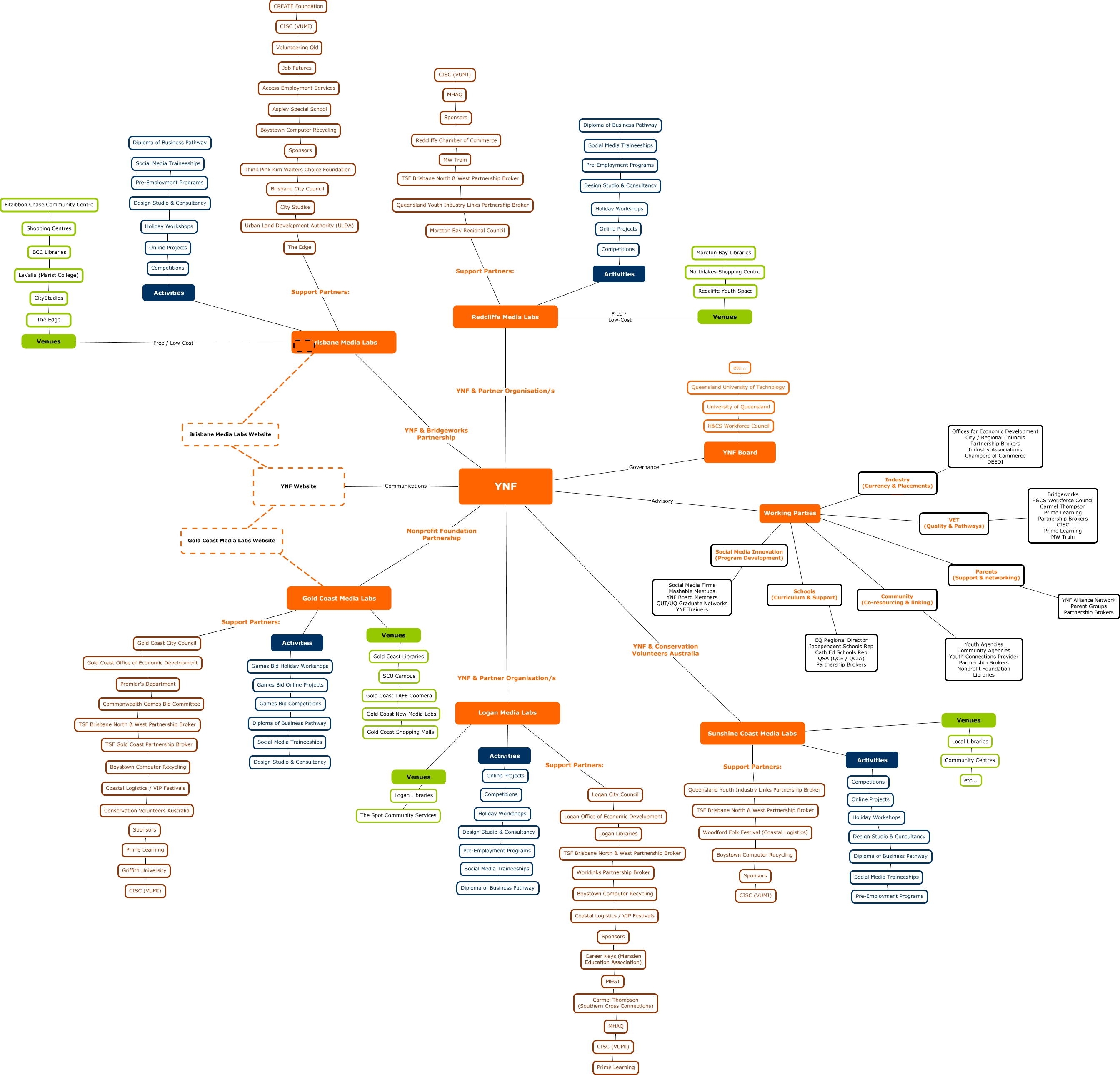 This Concept Map, created with IHMC CmapTools, has information related to: YNF Partnership Map November 2010, Redcliffe Media Labs ???? Activities, Competitions ???? Holiday Workshops, TSF Brisbane North & West Partnership Broker ???? Woodford Folk Festival (Coastal Logistics), Boystown Computer Recycling ???? Sponsors, Griffith University ???? CISC (VUMI), Design Studio & Consultancy ???? Diploma of Business Pathway, Think Pink Kim Walters Choice Foundation ???? Sponsors, YNF Website ???? Gold Coast Media Labs Website, Sunshine Coast Media Labs Support Partners: Queensland Youth Industry Links Partnership Broker, YNF Board ???? H&CS Workforce Council, Redcliffe Youth Space ???? Northlakes Shopping Centre, YNF Governance YNF Board, Venues ???? Logan Libraries, Job Futures ???? Access Employment Services, Games Bid Competitions ???? Diploma of Business Pathway, Social Media Traineeships ???? Diploma of Business Pathway, Worklinks Partnership Broker ???? Boystown Computer Recycling, Brisbane Media Labs Free / Low-Cost Venues, Logan Media Labs ???? Venues, H&CS Workforce Council ???? University of Queensland