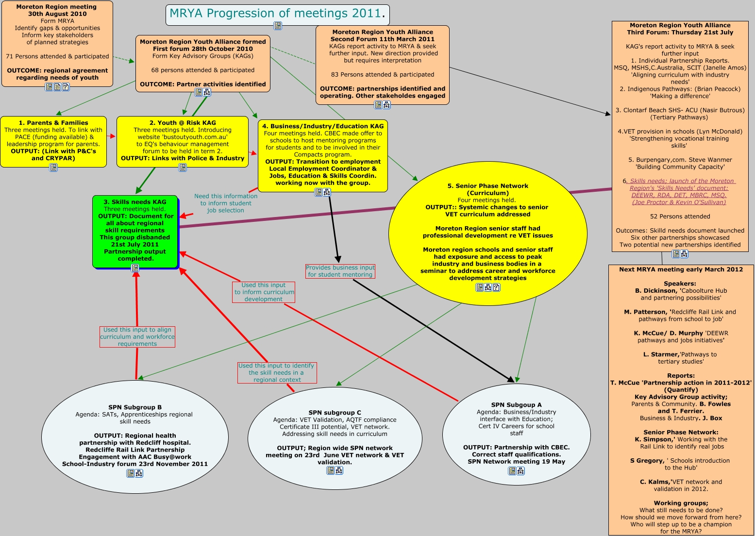 This Concept Map, created with IHMC CmapTools, has information related to: Overarching strategic CMAP.All planning data, 5. Senior Phase Network (Curriculum) Four meetings held. OUTPUT:: Systemic changes to senior VET curriculum addressed Moreton Region senior staff had professional development re VET issues Moreton region schools and senior staff had exposure and access to peak industry and business bodies in a seminar to address career and workforce development strategies ???? SPN Subgoup A Agenda: Business/Industry interface with Education; Cert IV Careers for school staff OUTPUT: Partnership with CBEC. Correct staff qualifications. SPN Network meeting 19 May, Moreton Region meeting 30th August 2010 Form MRYA Identify gaps & opportunities Inform key stakeholders of planned strategies 71 Persons attended & participated OUTCOME: regional agreement regarding needs of youth ???? Moreton Region Youth Alliance formed First forum 28th October 2010 Form Key Advisory Groups (KAGs) 68 persons attended & participated OUTCOME: Partner activities identified, SPN subgroup C Agenda: VET Validation, AQTF compliance Certificate III potential, VET network. Addressing skill needs in curriculum OUTPUT; Region wide SPN network meeting on 23rd June VET network & VET validation. Used this input to identify the skill needs in a regional context 3. Skills needs KAG Three meetings held. OUTPUT: Document for all about regional skill requirements This group disbanded 21st July 2011 Partnership output completed., SPN Subgoup A Agenda: Business/Industry interface with Education; Cert IV Careers for school staff OUTPUT: Partnership with CBEC. Correct staff qualifications. SPN Network meeting 19 May Used this input to inform curriculum development 3. Skills needs KAG Three meetings held. OUTPUT: Document for all about regional skill requirements This group disbanded 21st July 2011 Partnership output completed., Moreton Region Youth Alliance formed First forum 28th October 2010 Form Key Advisory Groups (KAGs) 68 persons attended & participated OUTCOME: Partner activities identified ???? Moreton Region Youth Alliance Second Forum 11th March 2011 KAGs report activity to MRYA & seek further input. New direction provided but requires interpretation 83 Persons attended & participated OUTCOME: partnerships identified and operating. Other stakeholdes engaged, 2. Youth @ Risk KAG Three meetings held. Introducing website 'bustoutyouth.com.au' to EQ's behaviour management forum to be held in term 2. OUTPUT: Links with Police & Industry ???? 4. Business/Industry/Education KAG Four meetings held. CBEC made offer to schools to host mentoring programs for students and to be involved in their Compacts program. OUTPUT: Transition to employment Local Employment Coordinator & Jobs, Education & Skills Coordin. working now with the group., 5. Senior Phase Network (Curriculum) Four meetings held. OUTPUT:: Systemic changes to senior VET curriculum addressed Moreton Region senior staff had professional development re VET issues Moreton region schools and senior staff had exposure and access to peak industry and business bodies in a seminar to address career and workforce development strategies ???? SPN subgroup C Agenda: VET Validation, AQTF compliance Certificate III potential, VET network. Addressing skill needs in curriculum OUTPUT; Region wide SPN network meeting on 23rd June VET network & VET validation., Moreton Region Youth Alliance formed First forum 28th October 2010 Form Key Advisory Groups (KAGs) 68 persons attended & participated OUTCOME: Partner activities identified ???? 1. Parents & Families Three meetings held. To link with PACE (funding available) & leadership program for parents. OUTPUT: (Link with P&C's and CRYPAR), Moreton Region Youth Alliance Second Forum 11th March 2011 KAGs report activity to MRYA & seek further input. New direction provided but requires interpretation 83 Persons attended & participated OUTCOME: partnerships identified and operating. Other stakeholdes engaged ???? Moreton Region Youth Alliance Third Forum: Thursday 21st July KAG's report activity to MRYA & seek further input 1. Individual Partnership Reports. MSQ, MSHS,C.Australia, SCIT (Janelle Amos) 'Aligning curriculum with industry needs' 2. Indigenous Pathways: (Brian Peacock) 'Making a difference' 3. Clontarf Beach SHS- ACU (Nasir Butrous) (Tertiary Pathways) 4.VET provision in schools (Lyn McDonald) 'Strengthening vocational training skills' 5. Burpengary,com. Steve Wanmer 'Building Community Capacity' 6. Skills needs; launch of the Moreton Region's 'Skills Needs' document: DEEWR, RDA, DET, MBRC, MSQ. (Joe Proctor & Kevin O'Sullivan) 52 Persons attended Outcomes: Skilld needs document launched Six other partnerships showcased Two potential new partnerships identified, 1. Parents & Families Three meetings held. To link with PACE (funding available) & leadership program for parents. OUTPUT: (Link with P&C's and CRYPAR) ???? 2. Youth @ Risk KAG Three meetings held. Introducing website 'bustoutyouth.com.au' to EQ's behaviour management forum to be held in term 2. OUTPUT: Links with Police & Industry, Moreton Region Youth Alliance formed First forum 28th October 2010 Form Key Advisory Groups (KAGs) 68 persons attended & participated OUTCOME: Partner activities identified ???? 3. Skills needs KAG Three meetings held. OUTPUT: Document for all about regional skill requirements This group disbanded 21st July 2011 Partnership output completed., 3. Skills needs KAG Three meetings held. OUTPUT: Document for all about regional skill requirements This group disbanded 21st July 2011 Partnership output completed. ???? Moreton Region Youth Alliance Third Forum: Thursday 21st July KAG's report activity to MRYA & seek further input 1. Individual Partnership Reports. MSQ, MSHS,C.Australia, SCIT (Janelle Amos) 'Aligning curriculum with industry needs' 2. Indigenous Pathways: (Brian Peacock) 'Making a difference' 3. Clontarf Beach SHS- ACU (Nasir Butrous) (Tertiar